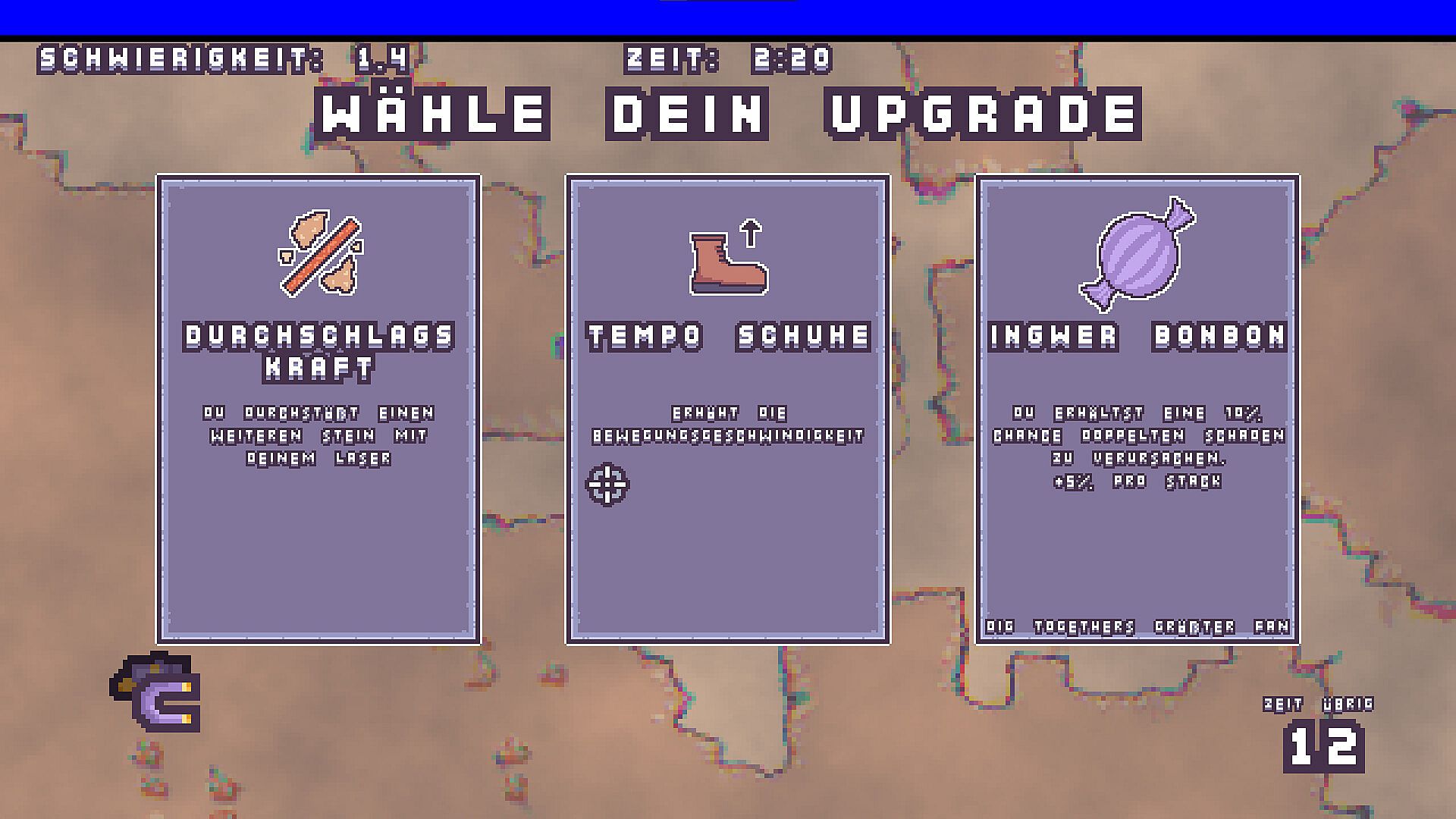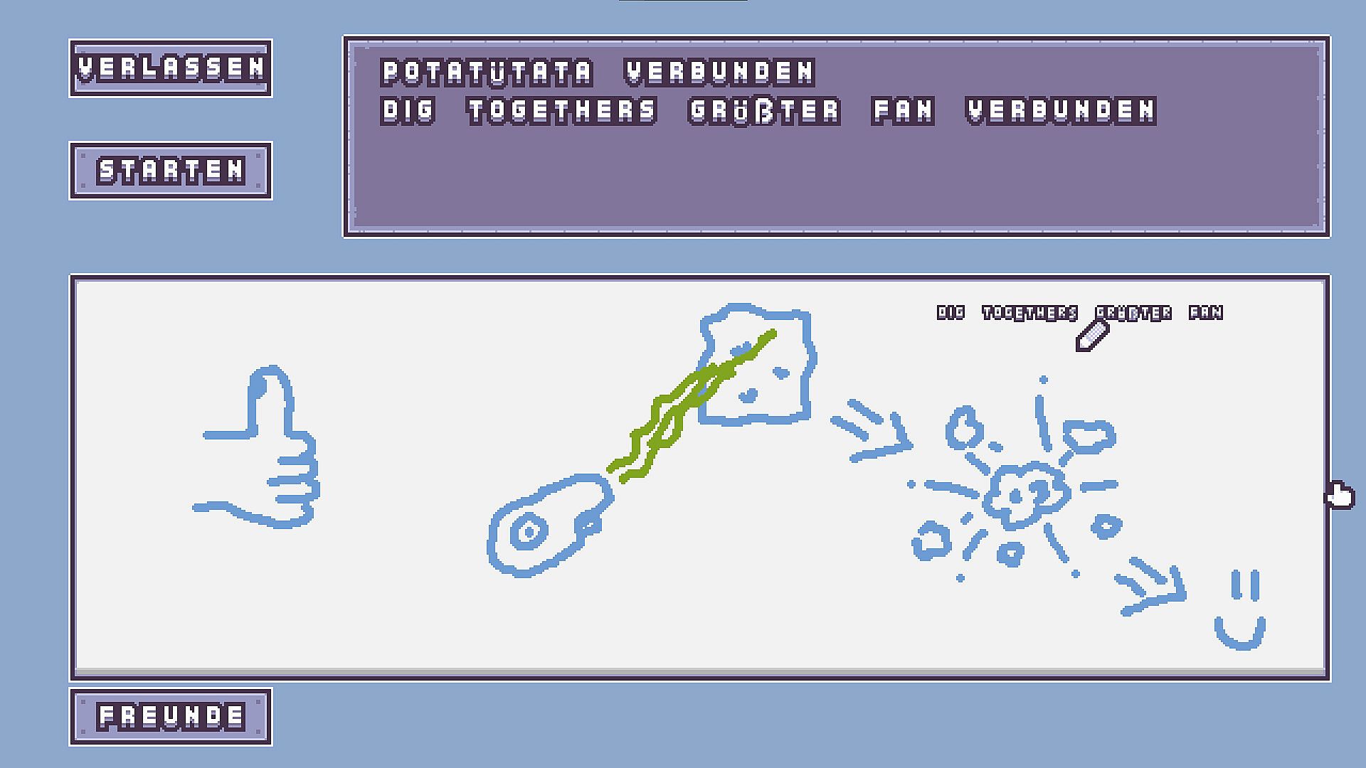 Dig Together ist ein Top Down Online Multiplayer Spiel, in dem du mit deinen Freunden zusammen in einer Höhle erscheinst. Ihr müsst Steine und Erze abbauen, Upgrades auswählen, um die Steine schneller abzubauen, und dabei herunterfallenden Steinen steigender Schwierigkeit ausweichen.