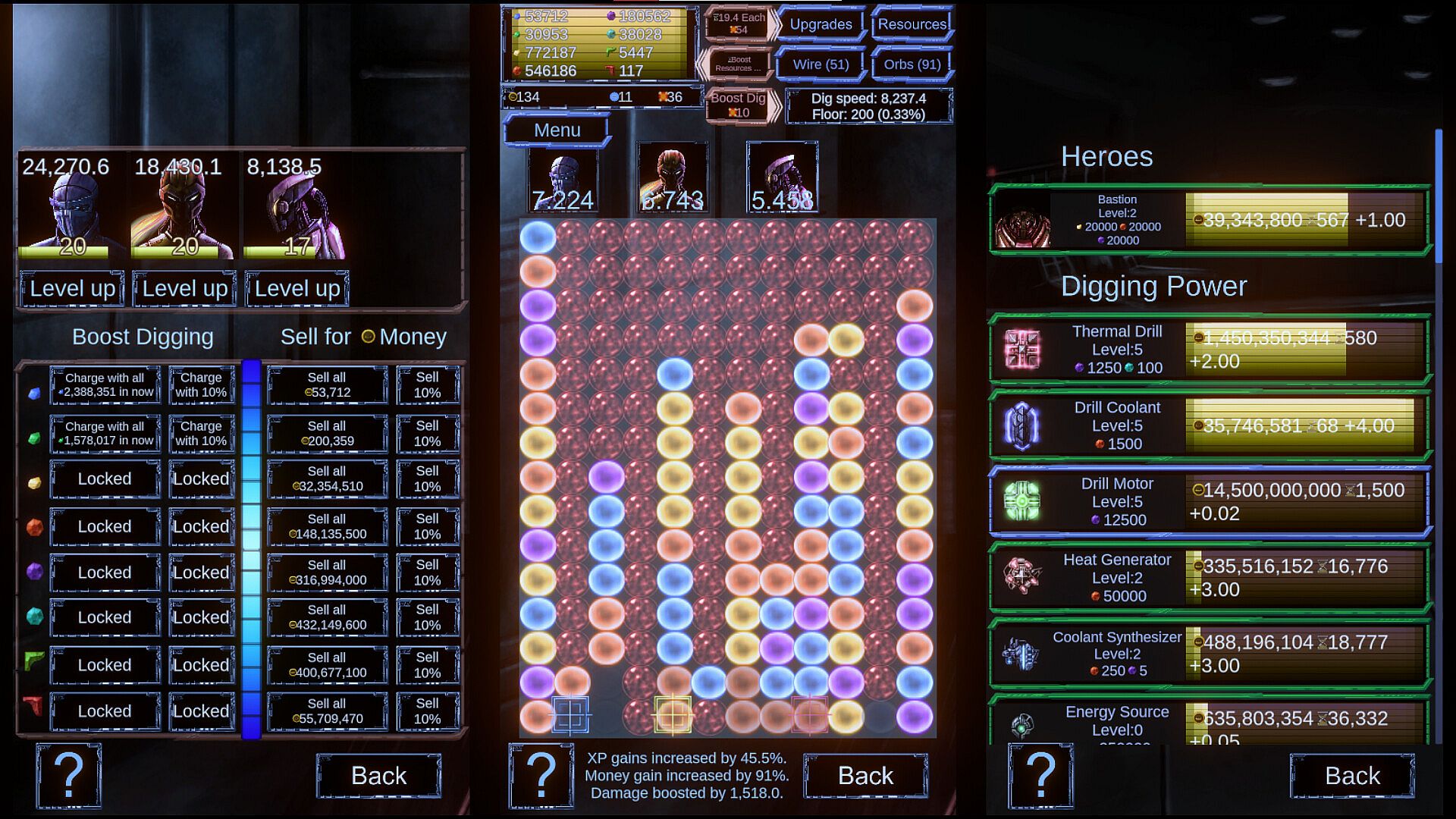 Your primary role is managing resources, making upgrades and collecting materials as you passively progress throughout the game. Floors yield you Resources, increase your Money gains and provide Intel and combat encounter opportunities. All of those are, in the end, used to make the process of digging through the floors faster by researching Upgrades, boosting your Drill and leveling up your team!