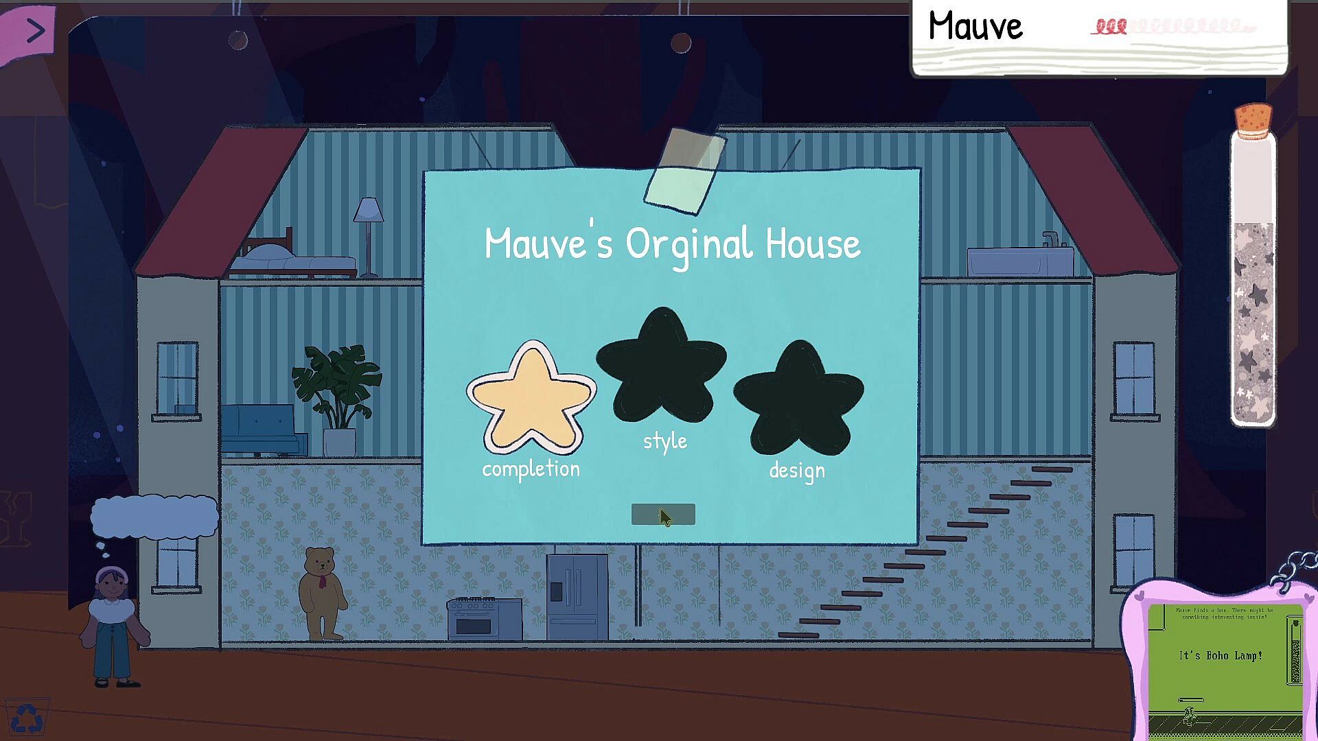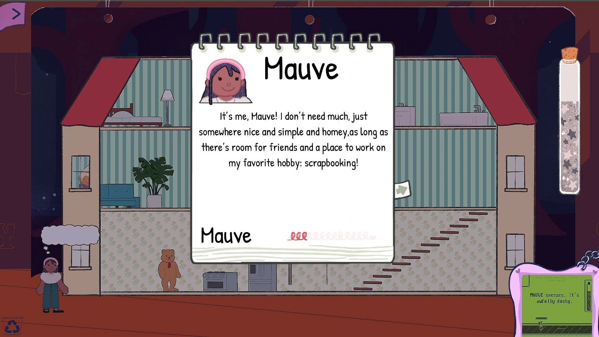 In story mode, Mauve decorates homes for other ragdolls she meets! From their descriptions and appearances, figure out the way they'd like their homes to look. Make them happy and you'll earn unique perks, like new house styles and even the ability to invite the ragdolls to your home!