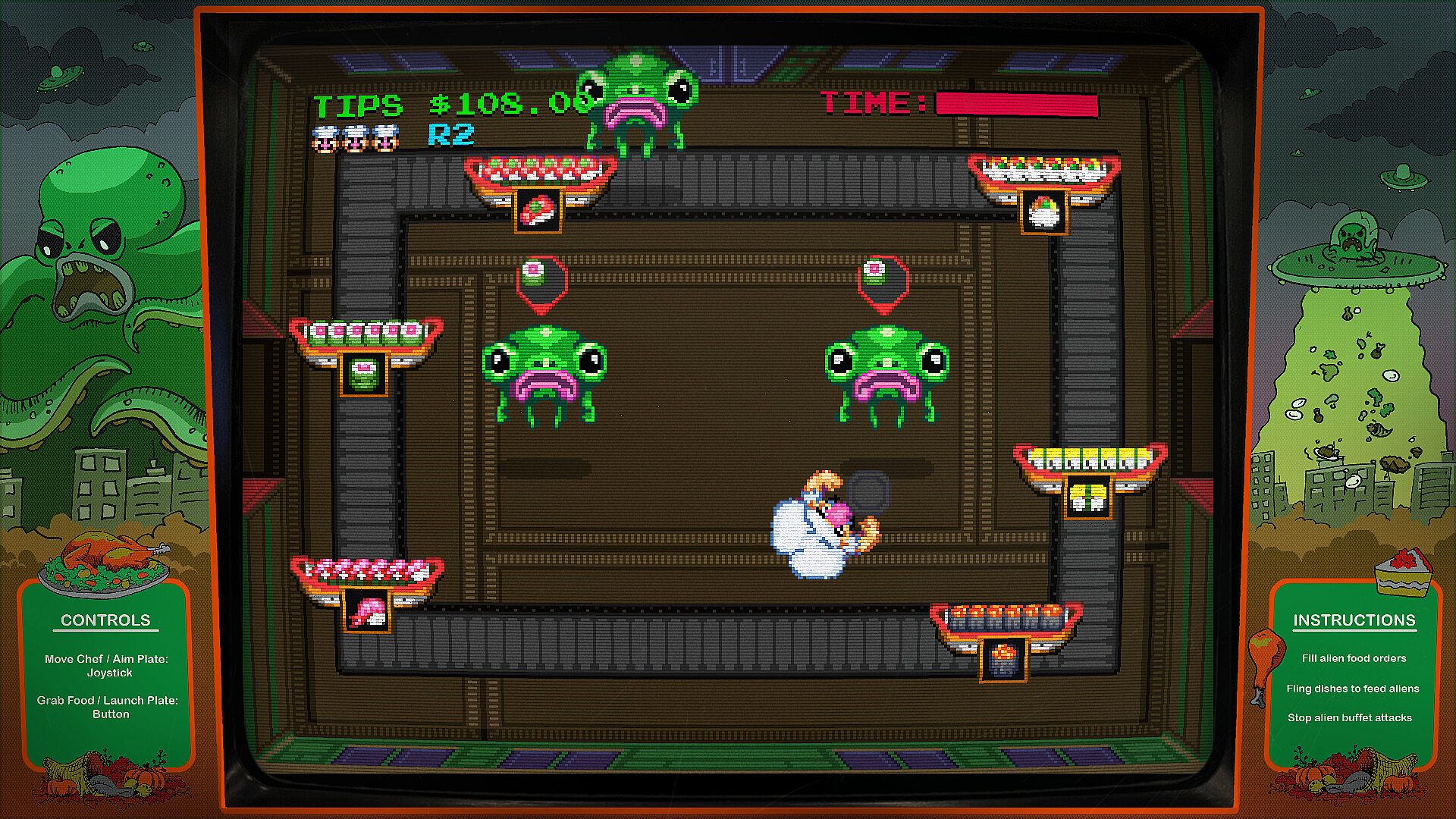 The ravenous Buffetlians from the planet Divowrr travel the galaxy in search of savory delights — and they've finally set their sights on Earth! But instead of eating the populace, they're curious to participate in the exotic culinary ritual they assume was named for them: "the buffet." Attracted to the bright lights of Las Vegas but lacking the social graces (and opposable thumbs) of the local populace, the Buffetlians expect to be served immediately upon their arrival — and if they don't get the food they crave, they'll start snacking straight from the buffet itself! Can you assemble all the plates and deliver all the meals before your uninvited guests destroy the dining room?