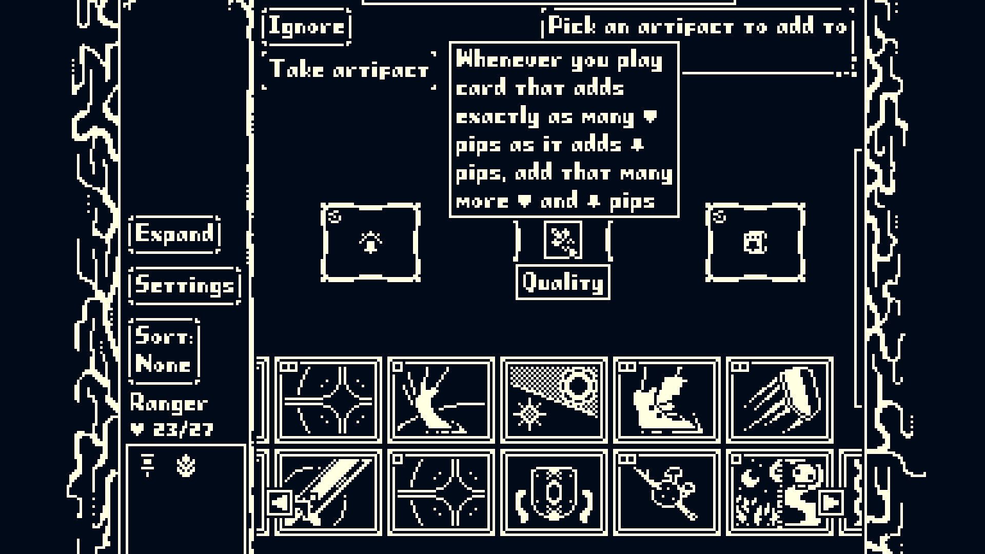 Cards are written with strings of 'pips' that can deal damage, reinforce your block, or even change the mode of every other card in the battle. Pips can be moved, shuffled, inverted, or transformed into other pips, making cards into something new entirely!