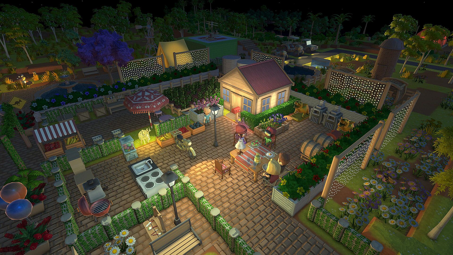 What starts as a simple campfire and a sleeping bag can grow into a thriving town with shops, fountains, flower beds, and windmills.