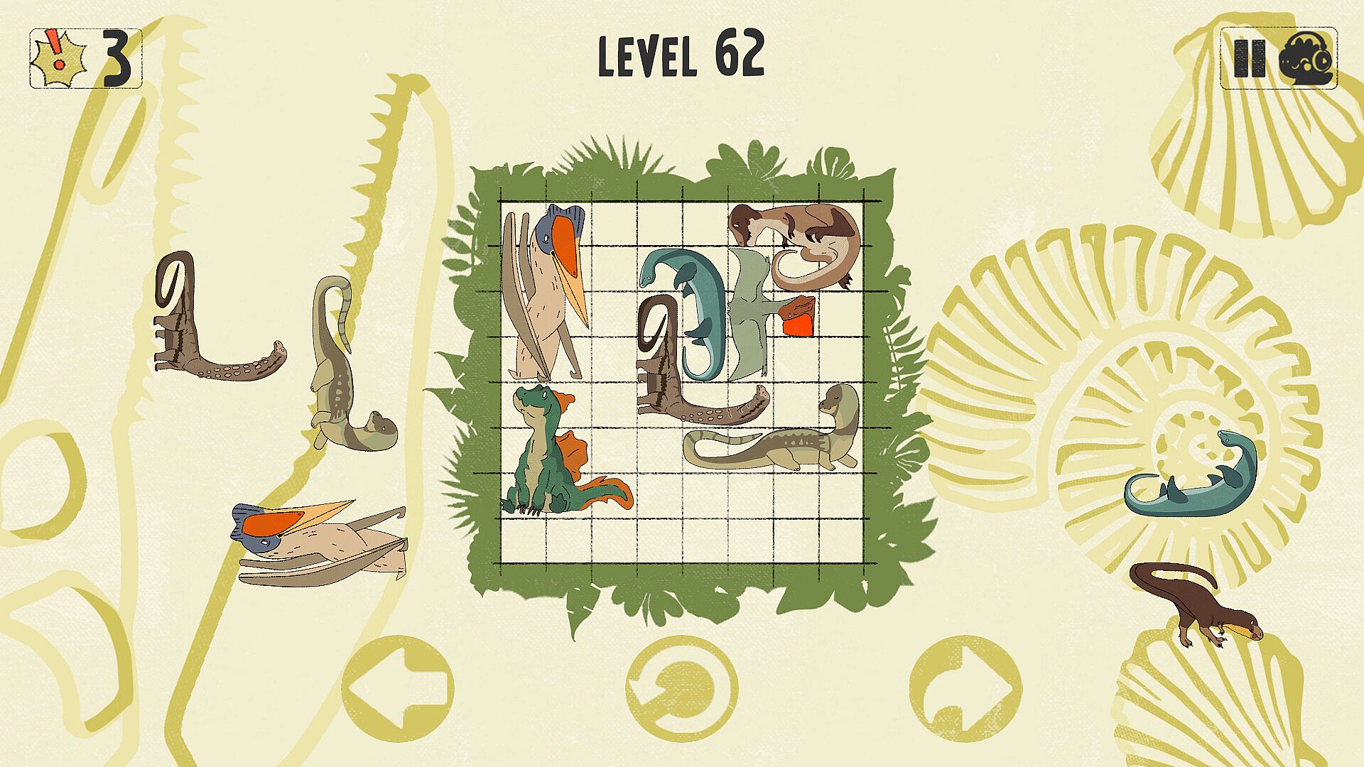 Are you ready to embark on a prehistoric adventure? In Dinosaurs in Place, you'll meet 40 unique dinosaurs, each with its own shape and character. Your task is to place them on the grid so that they fit perfectly into the allotted space.