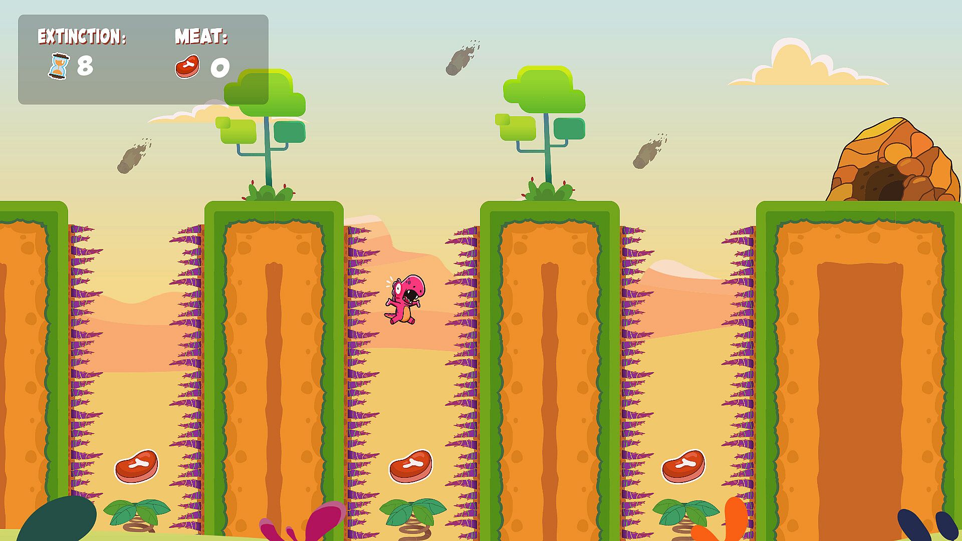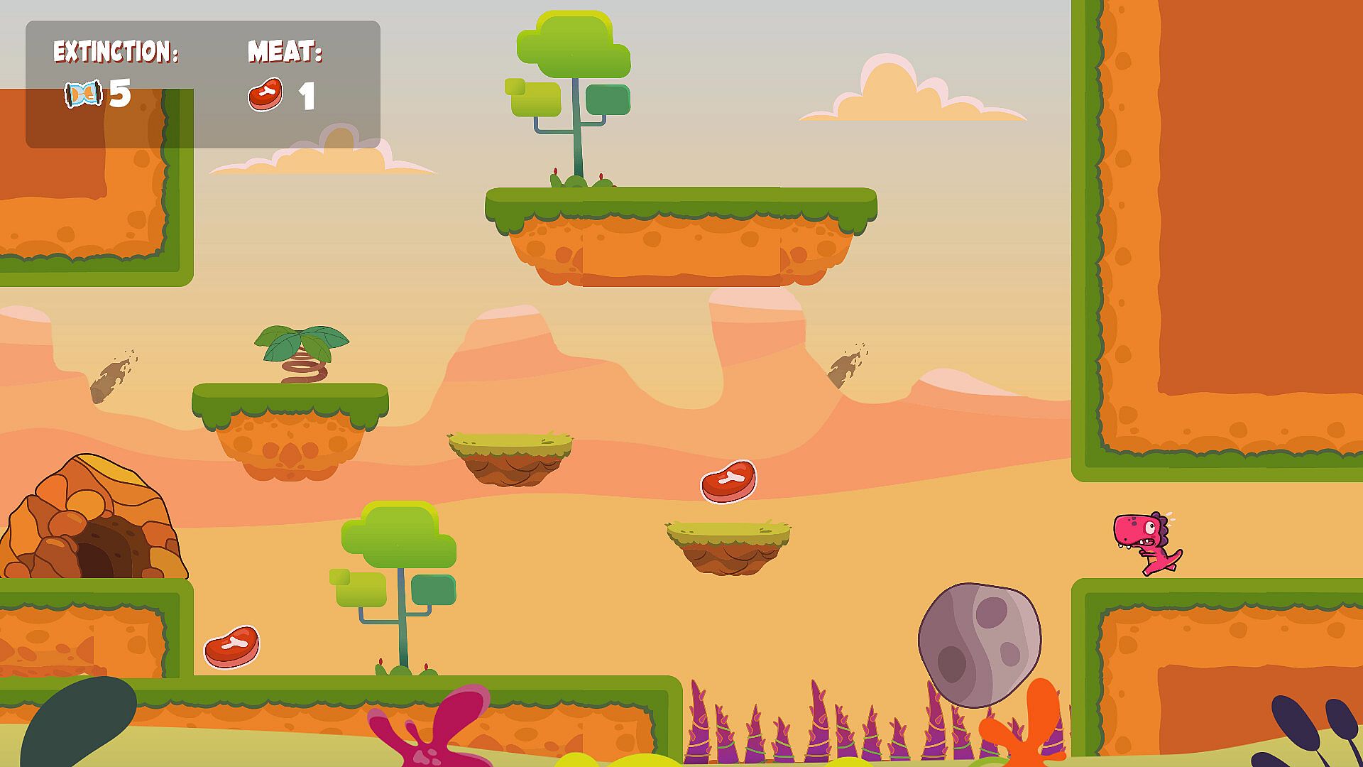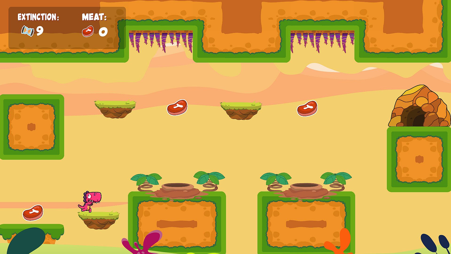 Dinus is a little dinosaur living in a prehistoric world full of dangers. On a fateful day, Dinus realizes that a giant meteor is about to collide with Earth, causing mass extinction! With only 10 seconds to react, you must help Dinus collect all the pieces of meat in each level and take refuge in his cave before it's too late!