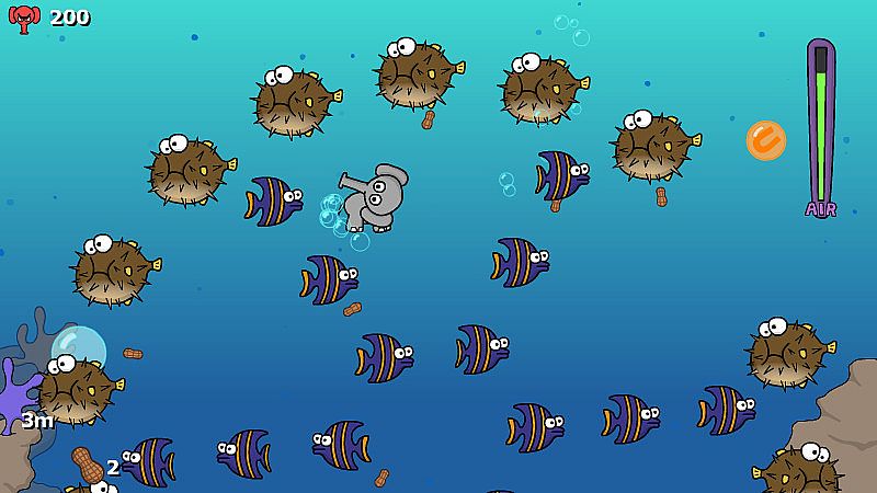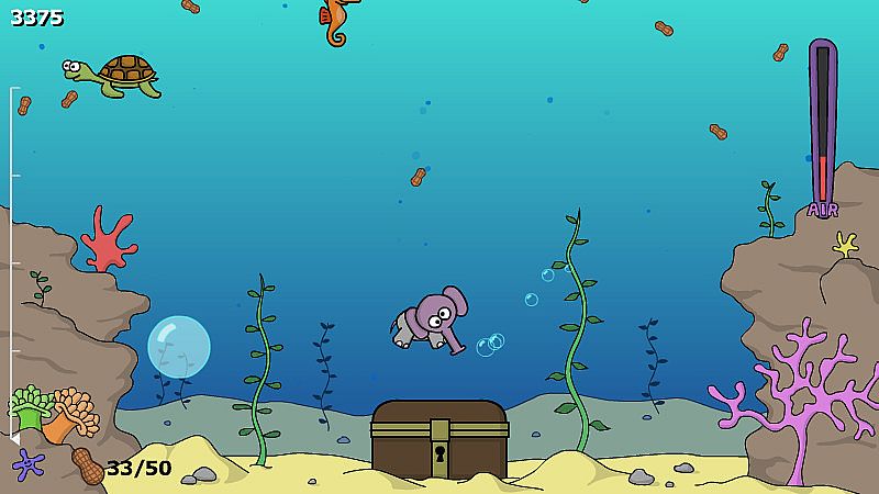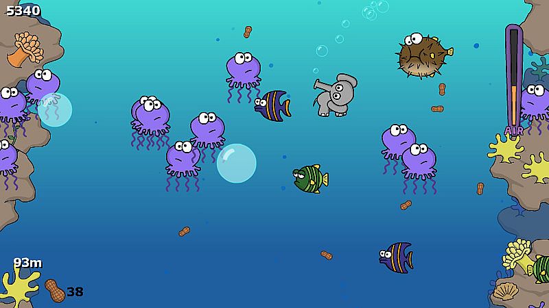 It is your task to help 'Trunks' dive down into the deep ocean to retrieve as many peanuts as possible, all whilst gulping air bubbles to stay alive and avoiding unkindly marine life.