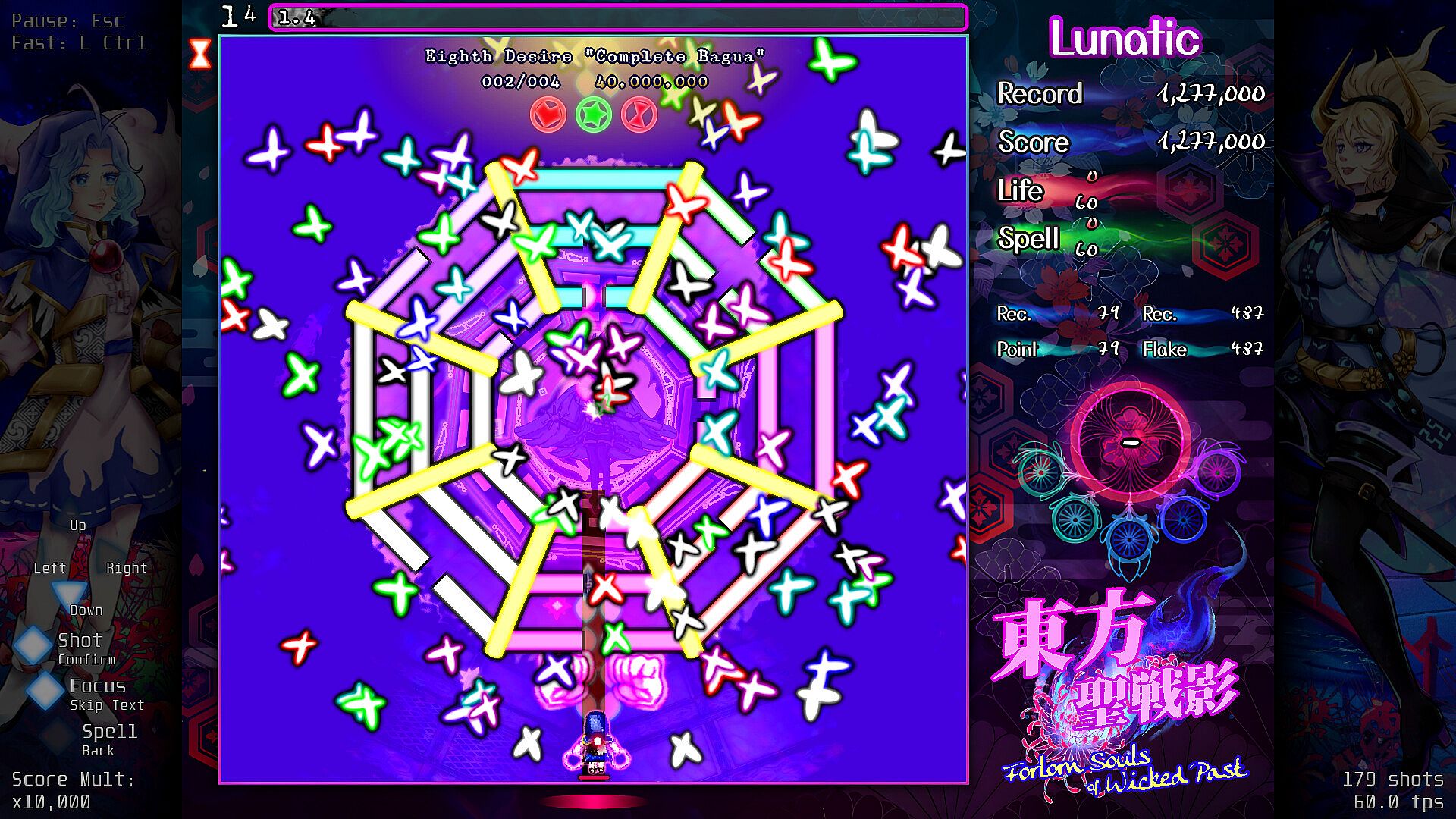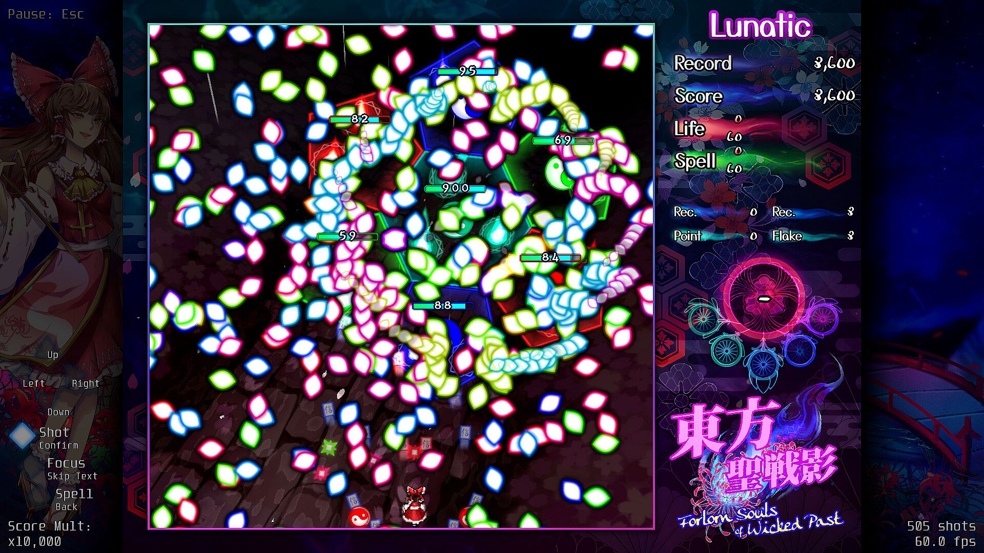 Mechanics reminiscent of mainline games Touhou 12 - Undefined Fantastic Object and Touhou 17 - Wily Beast and Weakest Creature's token systems alongside fangame concepts, namely Elegant Impermance of Sakura's dye chaining and Blue Devil in the Belvedere's extra stage blood gems take center stage in this game. You will quickly find out after encountering your first foes that some of them possess strange auras that contain some human souls. It looks like some sentient Yin-Yang orbs have captured them and are using them to attack you! Well, upon their defeat, you can capture them back. Each soul that was inside the aura will reward you with a spirit coin of the same color, consisting of Red, Green, Blue, and Rainbow. Collecting them clears away nearby bullets and gives some nice rewards: