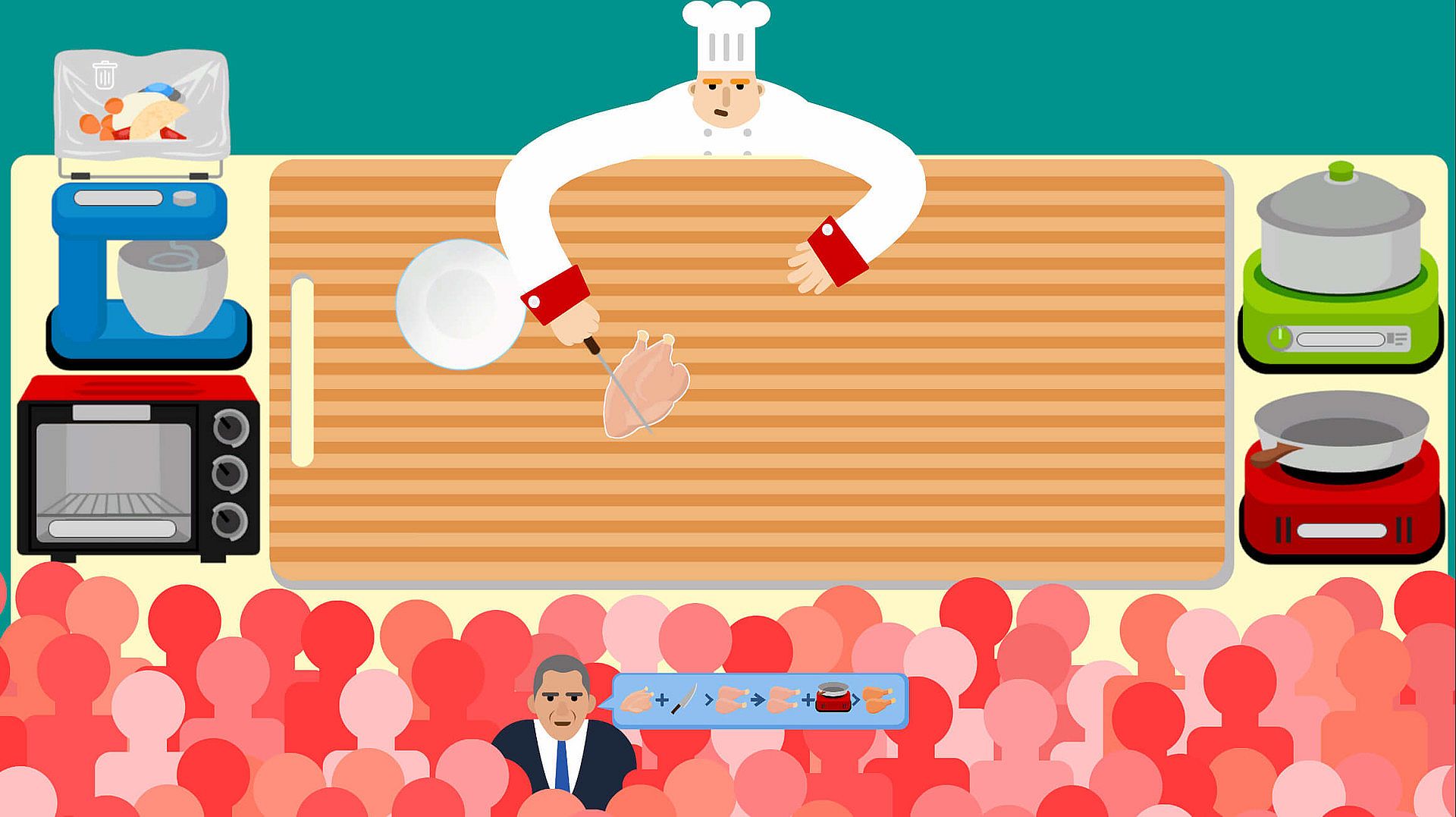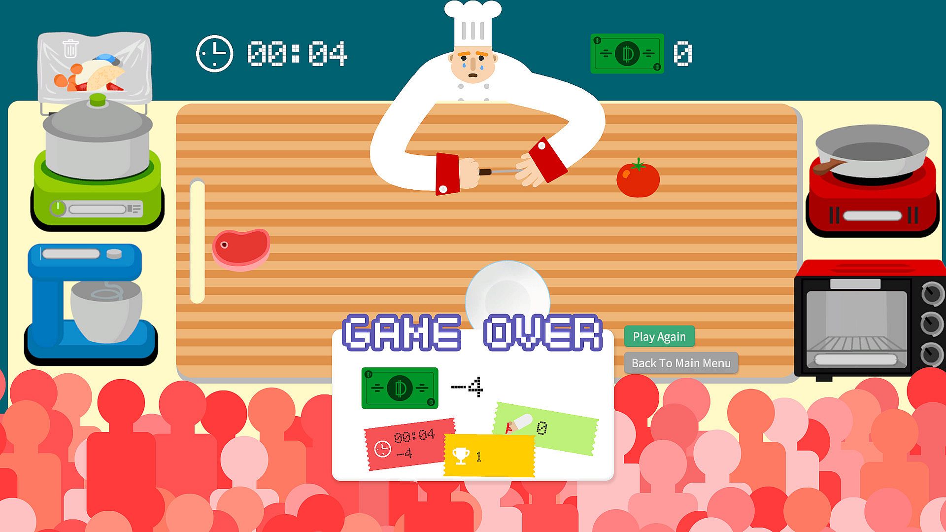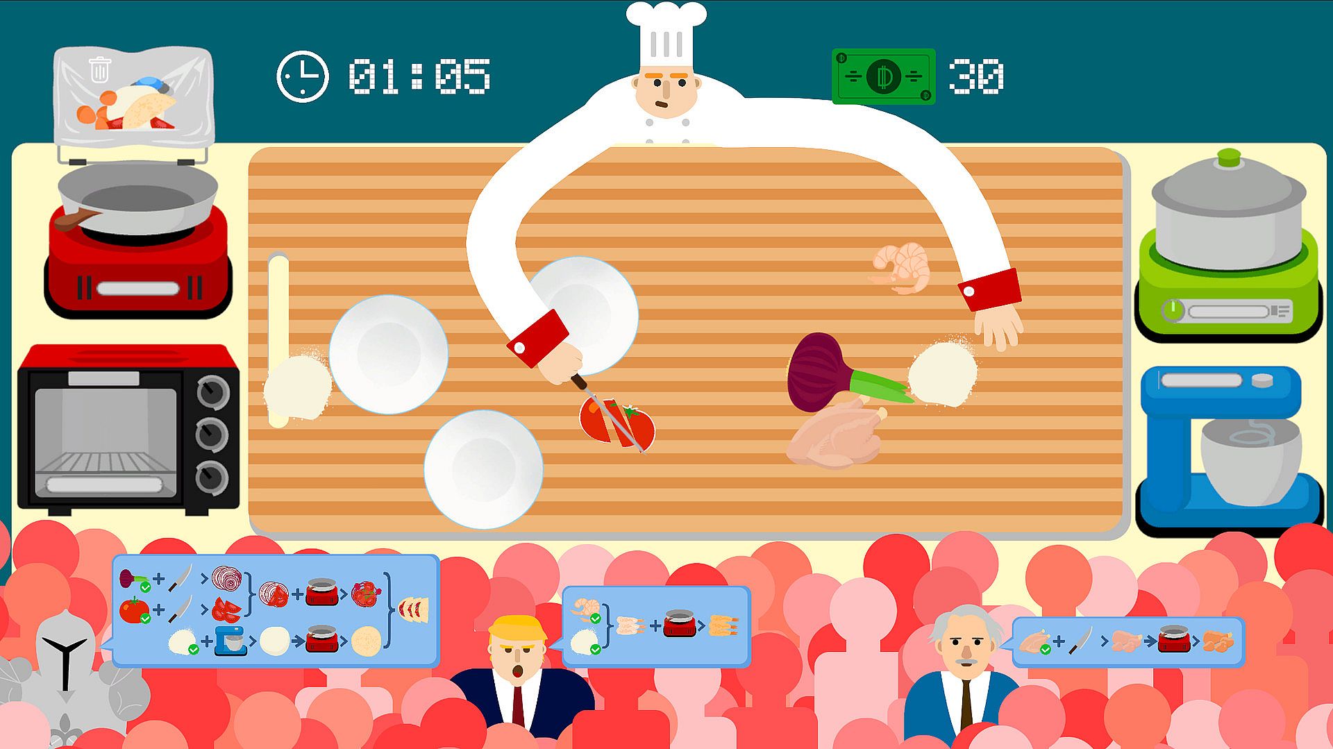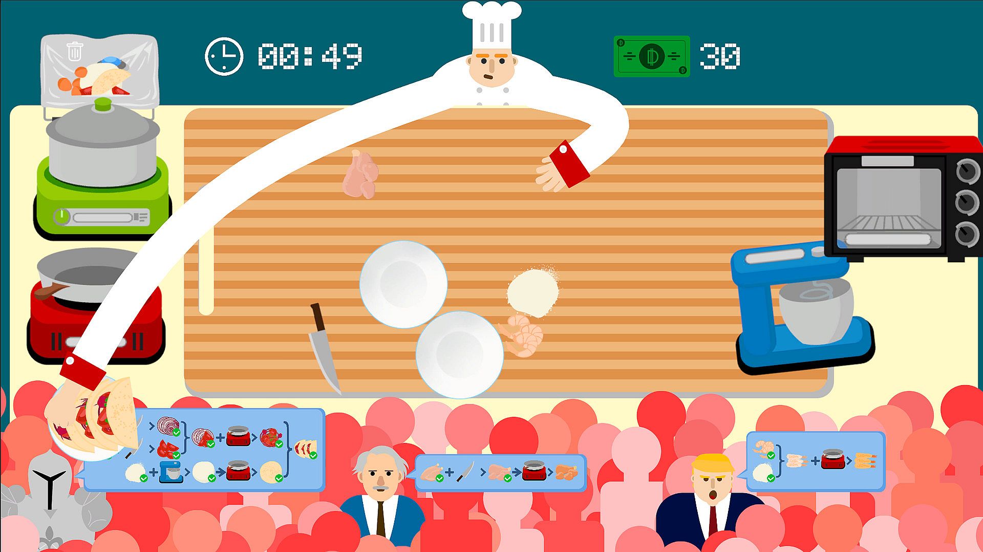 You become a chef, working for a nonsense restaurant. Your job is to satisfy customers' appetite as quickly as possible.