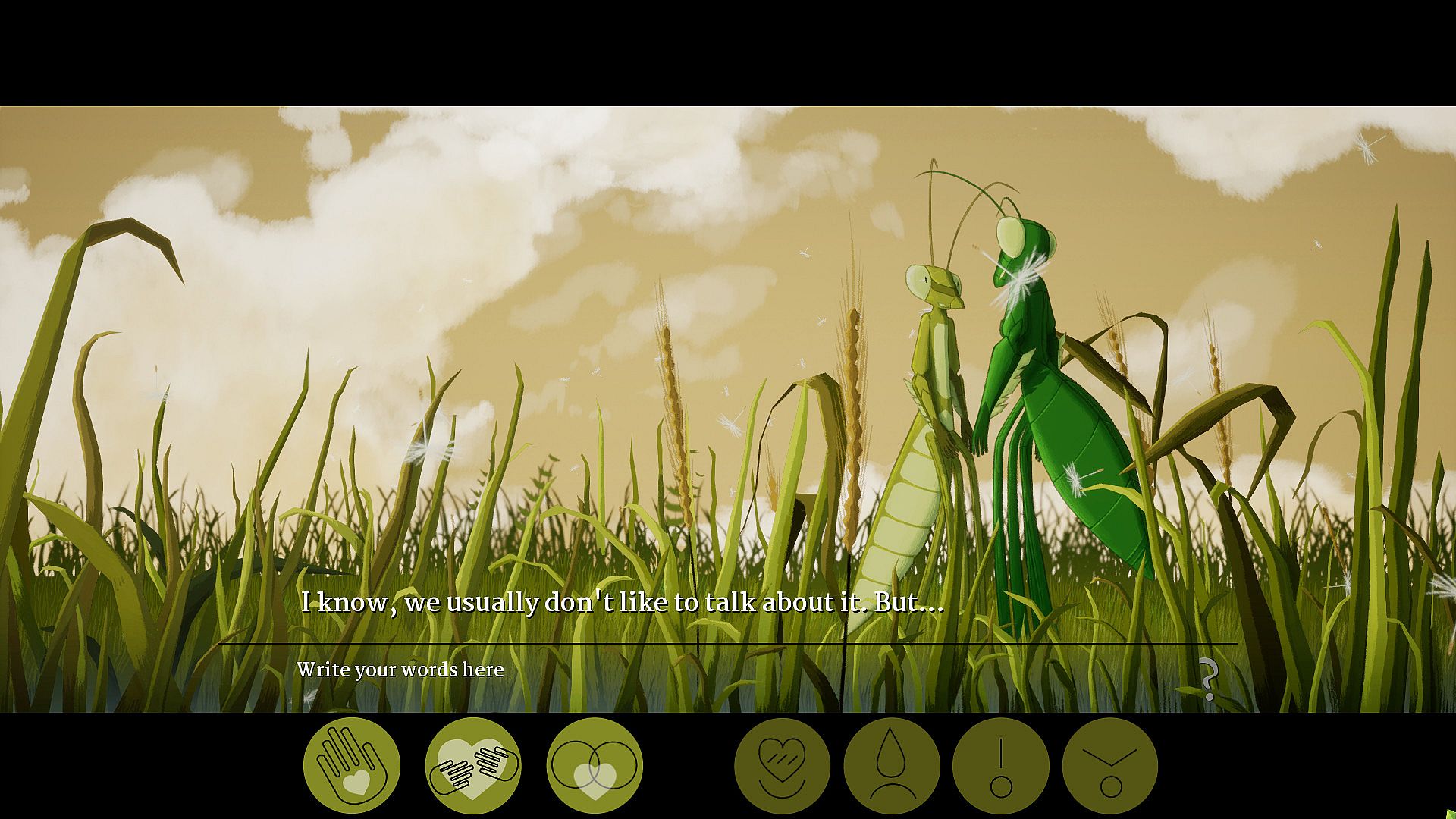 Assume the role of a praying mantis in a relationship dilemma. Torn between their mutual love and the instinct to have sex – which could lead to the male mantis’s death – the couple is now on the verge of making a decision. Try to keep their relationship in balance by typing anything you want in response to your partner during this life-changing conversation. Do your best to convey your feelings in a situation without satisfying solution.