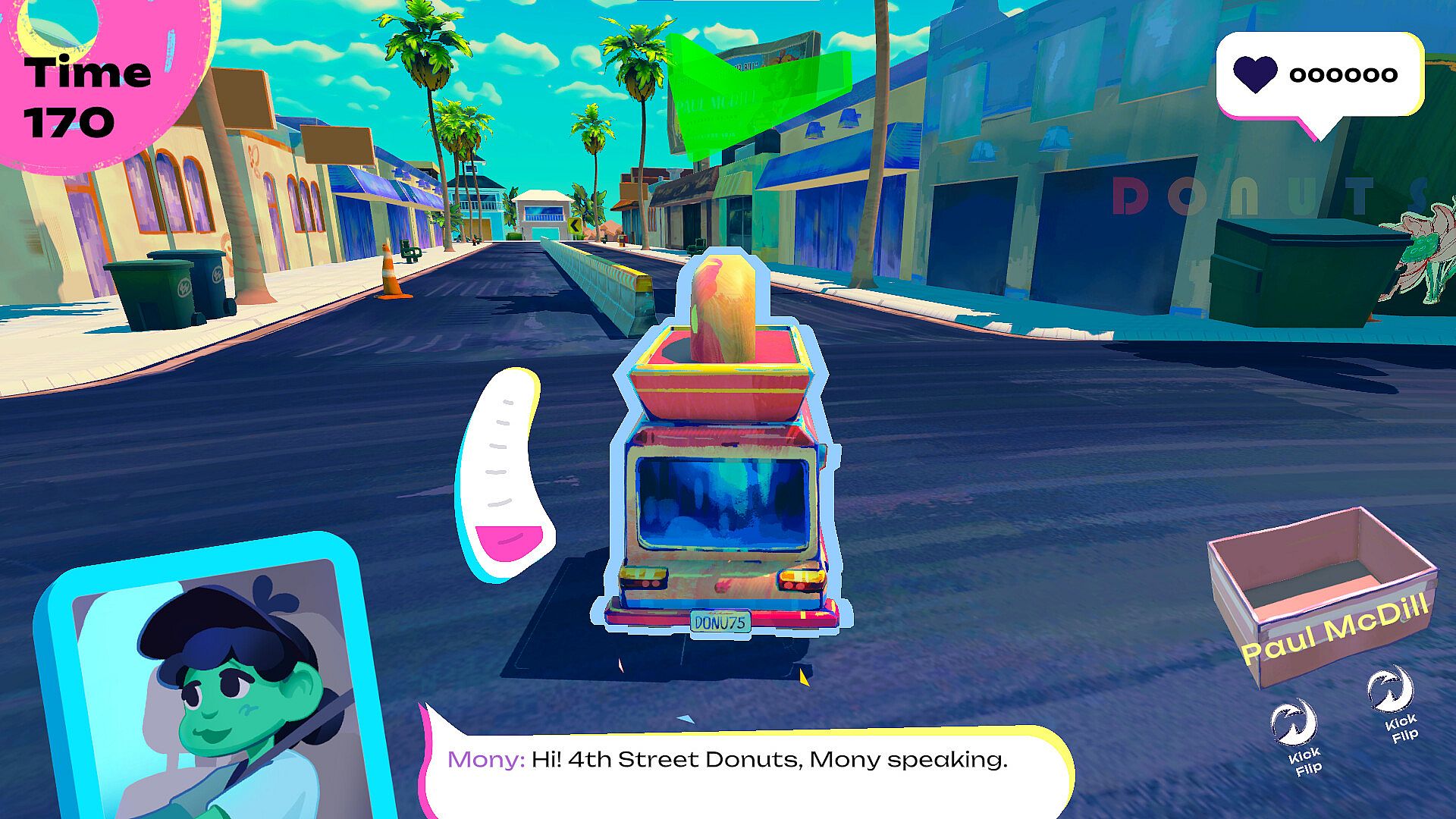 Once you've completed making the donuts, it's up to you to find and deliver it to your next eager customer! The more you deliver and stunt across the city, the more your fame will go up! Get enough attention and you might start getting orders from familiar faces!