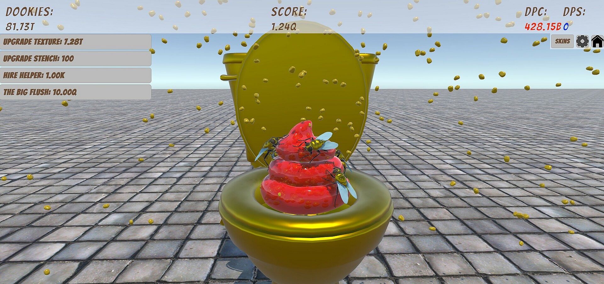 • Push Harder: Upgrade your clicking power, passive income, and more to turn your dookie into a grotesque masterpiece that would make even the most seasoned toilet tremble. Finish it all with The Big Flush™️ and then hit endless mode to complete your collection of skins.