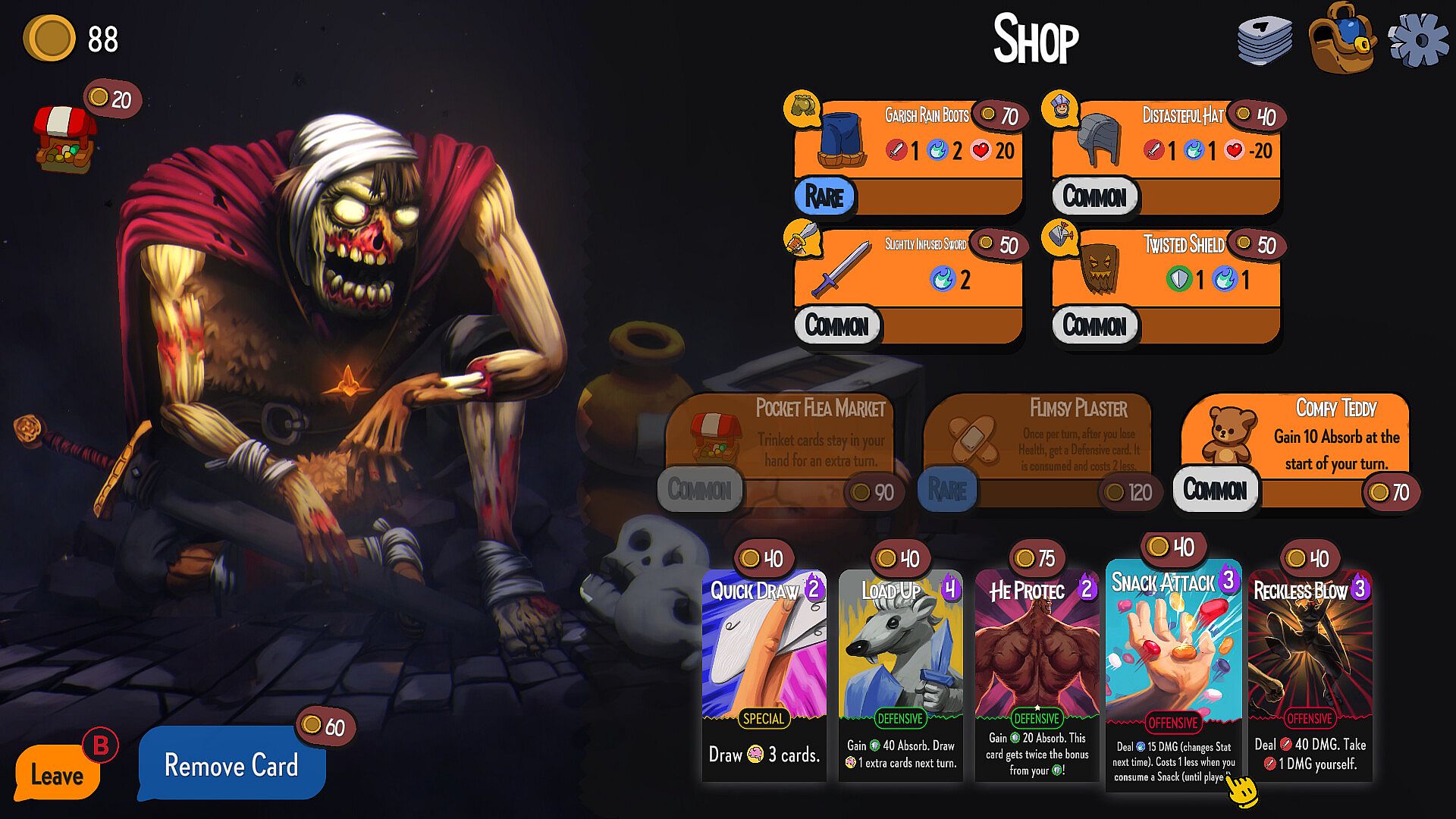 - Build a deck from over 100 cards and master ridiculous synergies: turn your enemies into gold, abuse their fragile egos while cowering behind your summons, throw food at people, and more!
