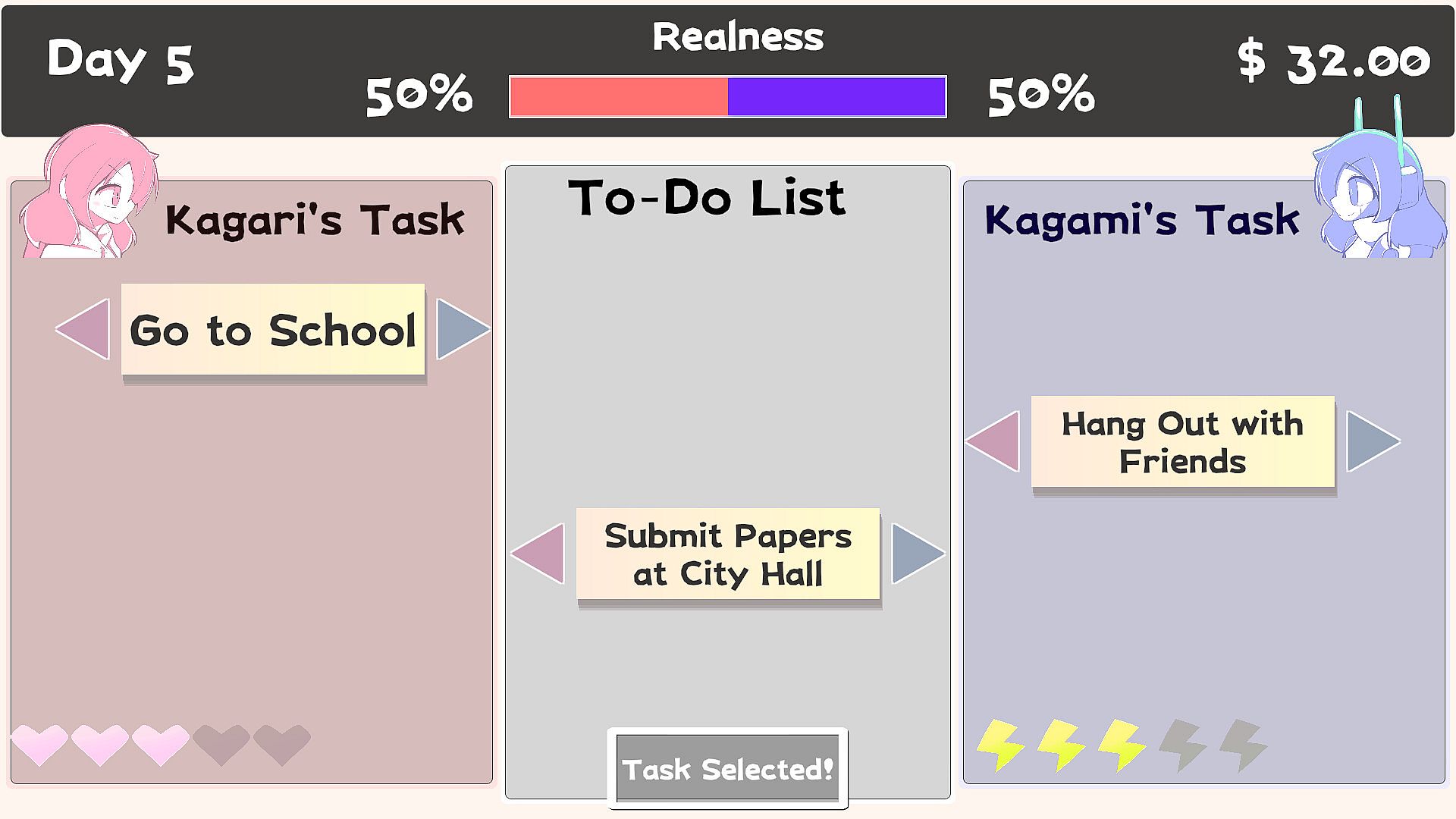 As the player, all you do is decide which tasks—like “go to school” or “spend time with friends”—