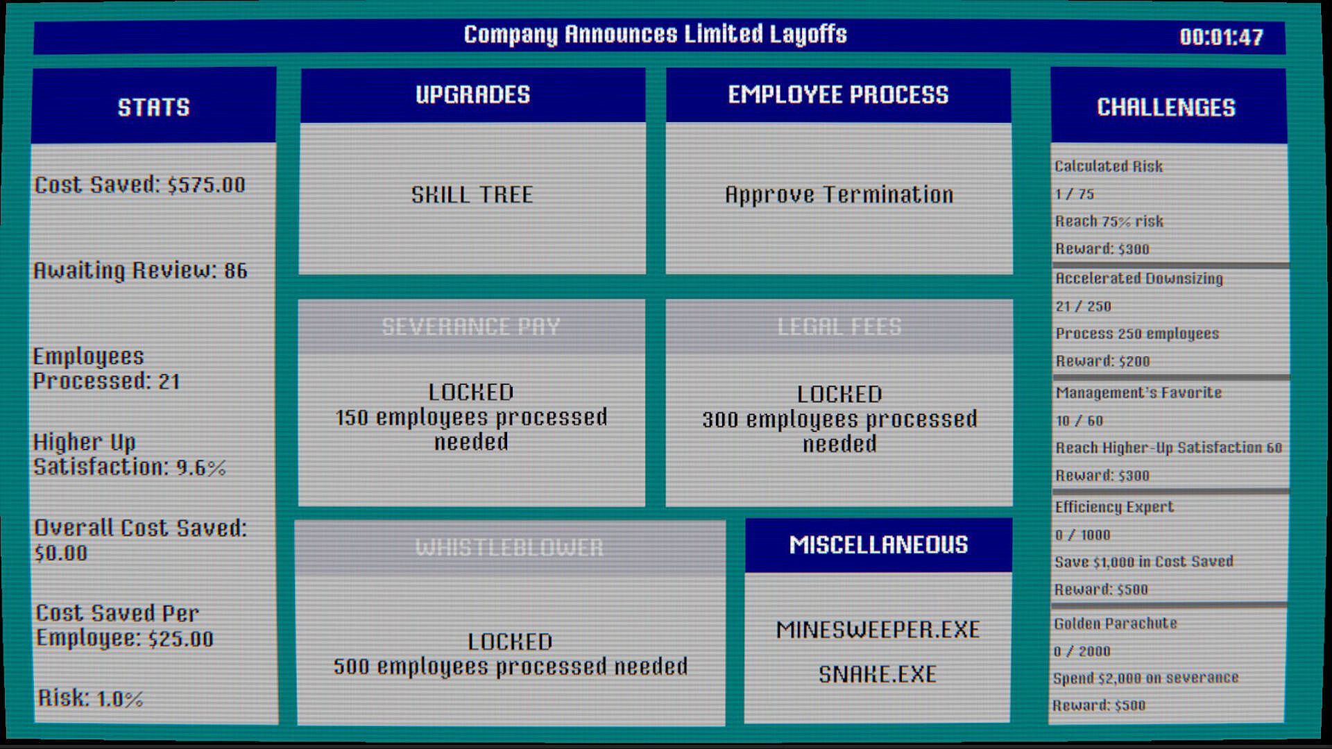 Welcome to the corporate machine. In DOWNSIZING.EXE, you are the unseen architect of fiscal efficiency. Your objective is simple: navigate the high-stakes world of corporate restructuring and save the company $50,000 in total costs. Every decision carries weight, and every "termination" fuels your bottom line.
