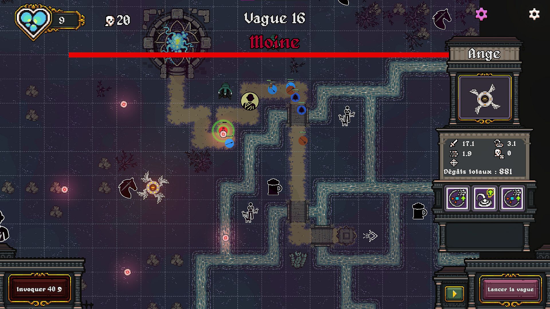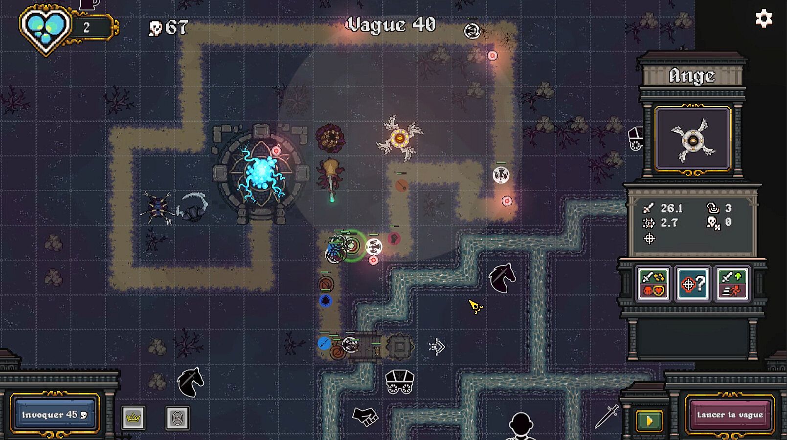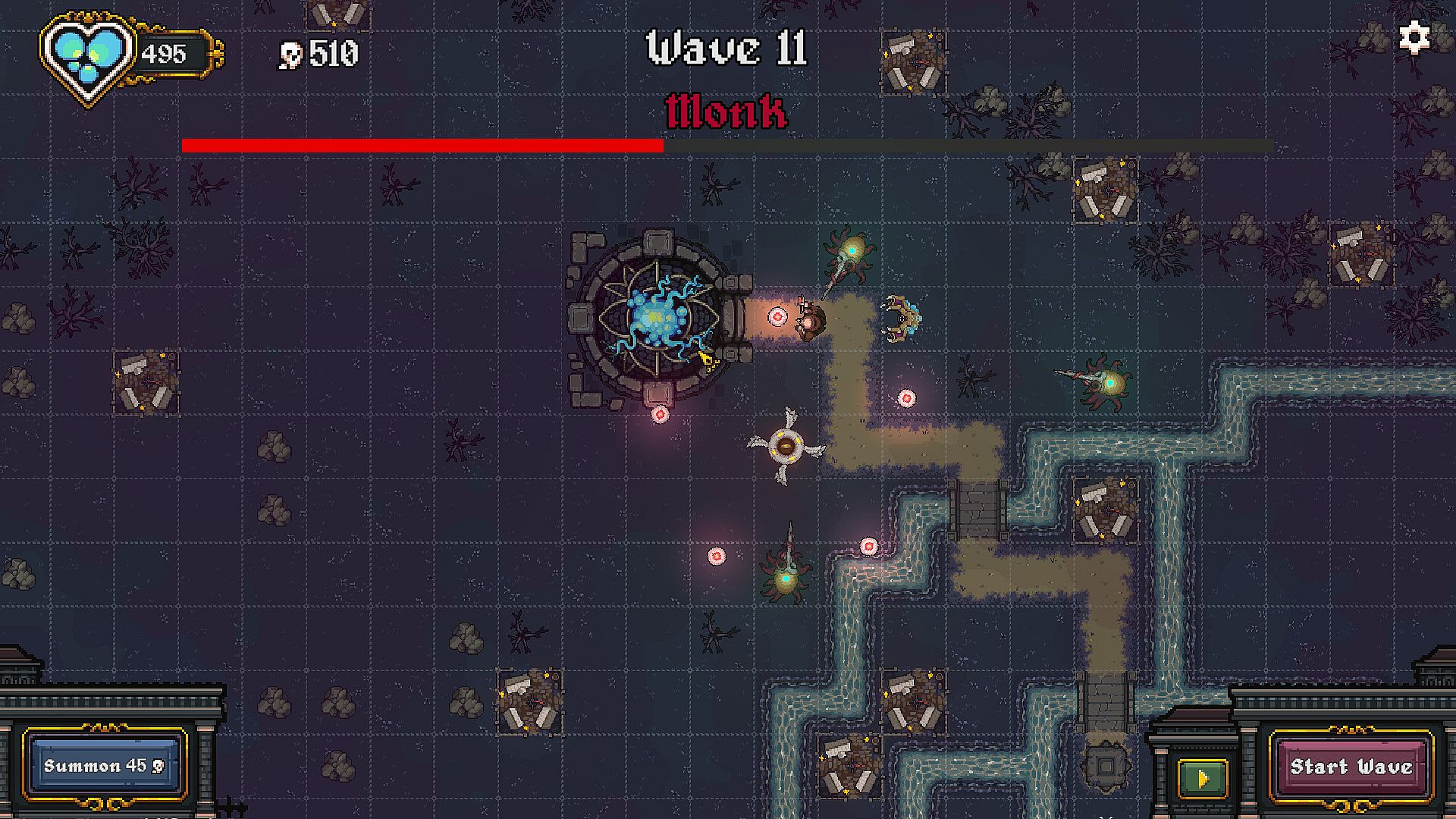 Summoning involves offering souls to draft three unique defenders, each equipped with a random blessing that defines their abilities. From these, one is chosen to deploy on the battlefield. Upgrading comes through sacrifice, where players can transfer a blessing from one defender to another, building stronger units over time.