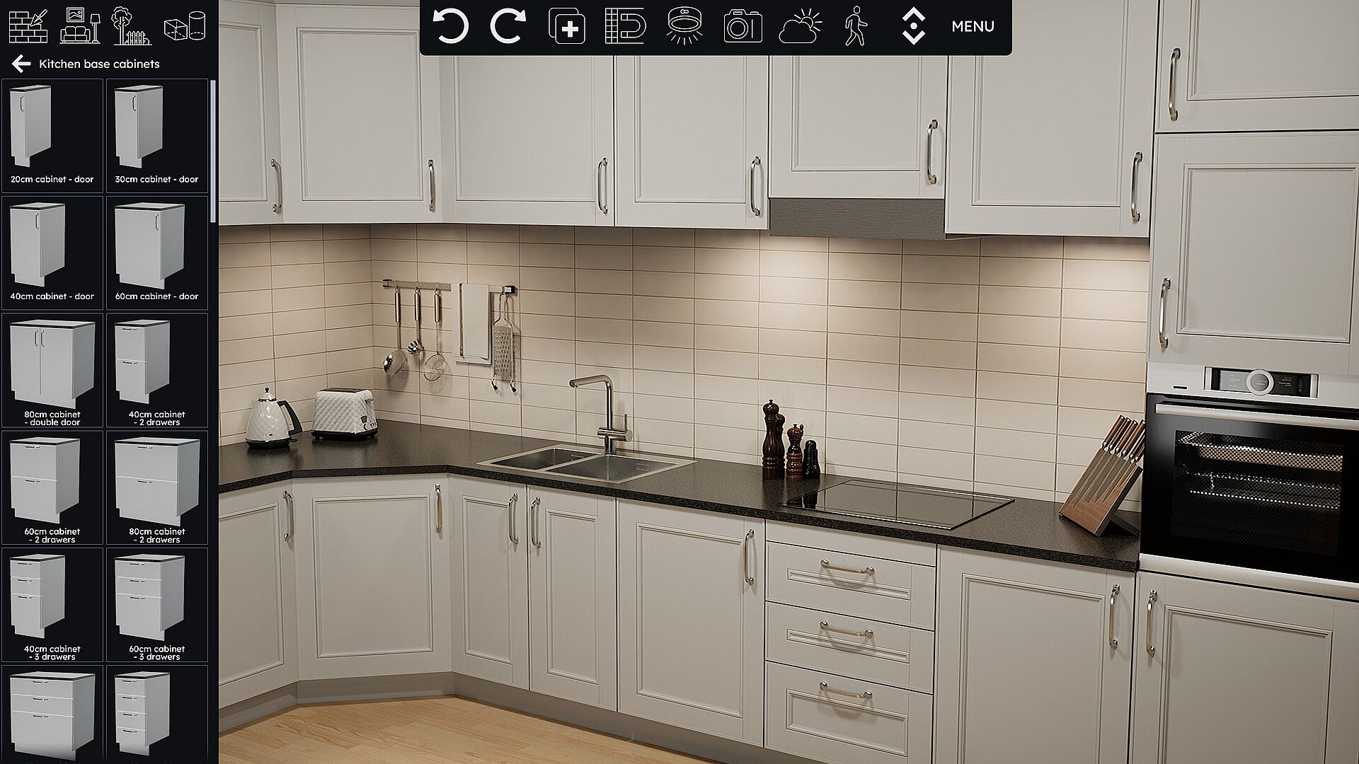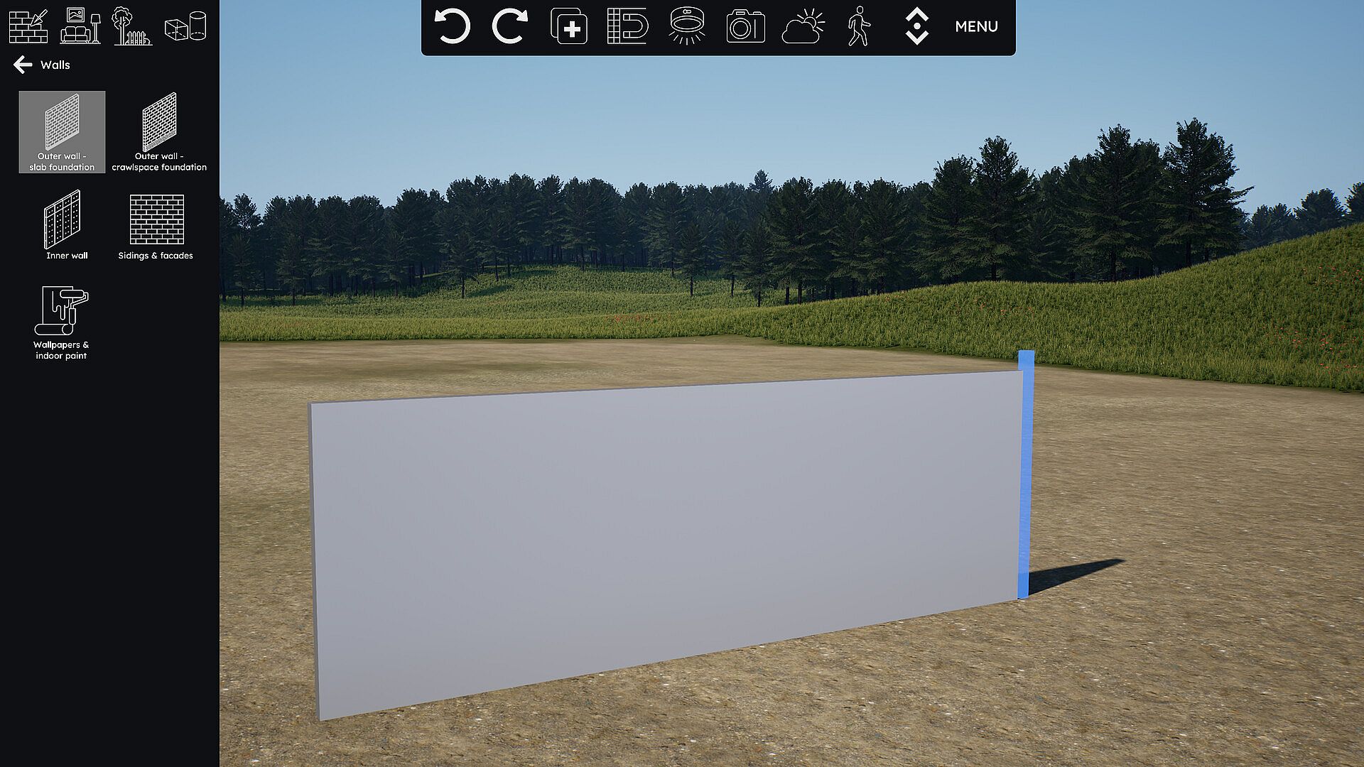 Build a house from the ground up by placing and adjusting walls, selecting facade materials and adding windows and doors.