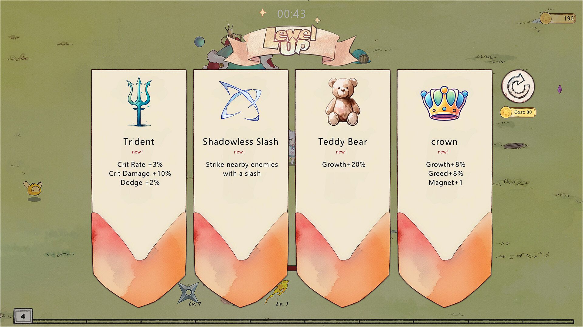 Pick up experience to upgrade, and select weapons and props on the upgrade page!