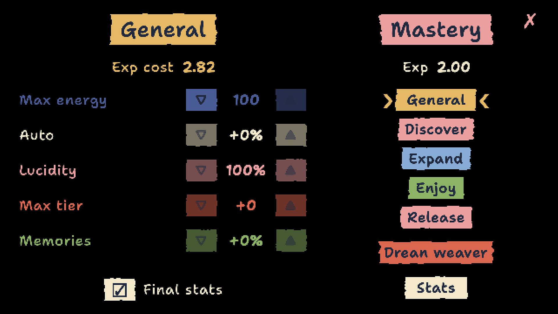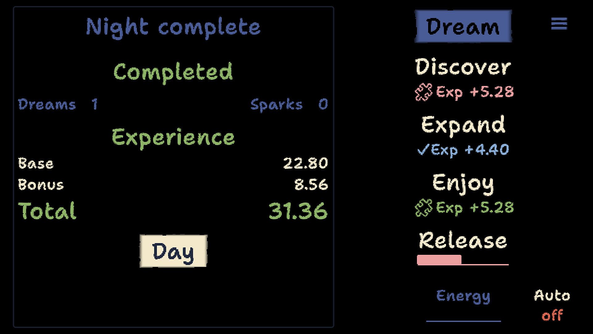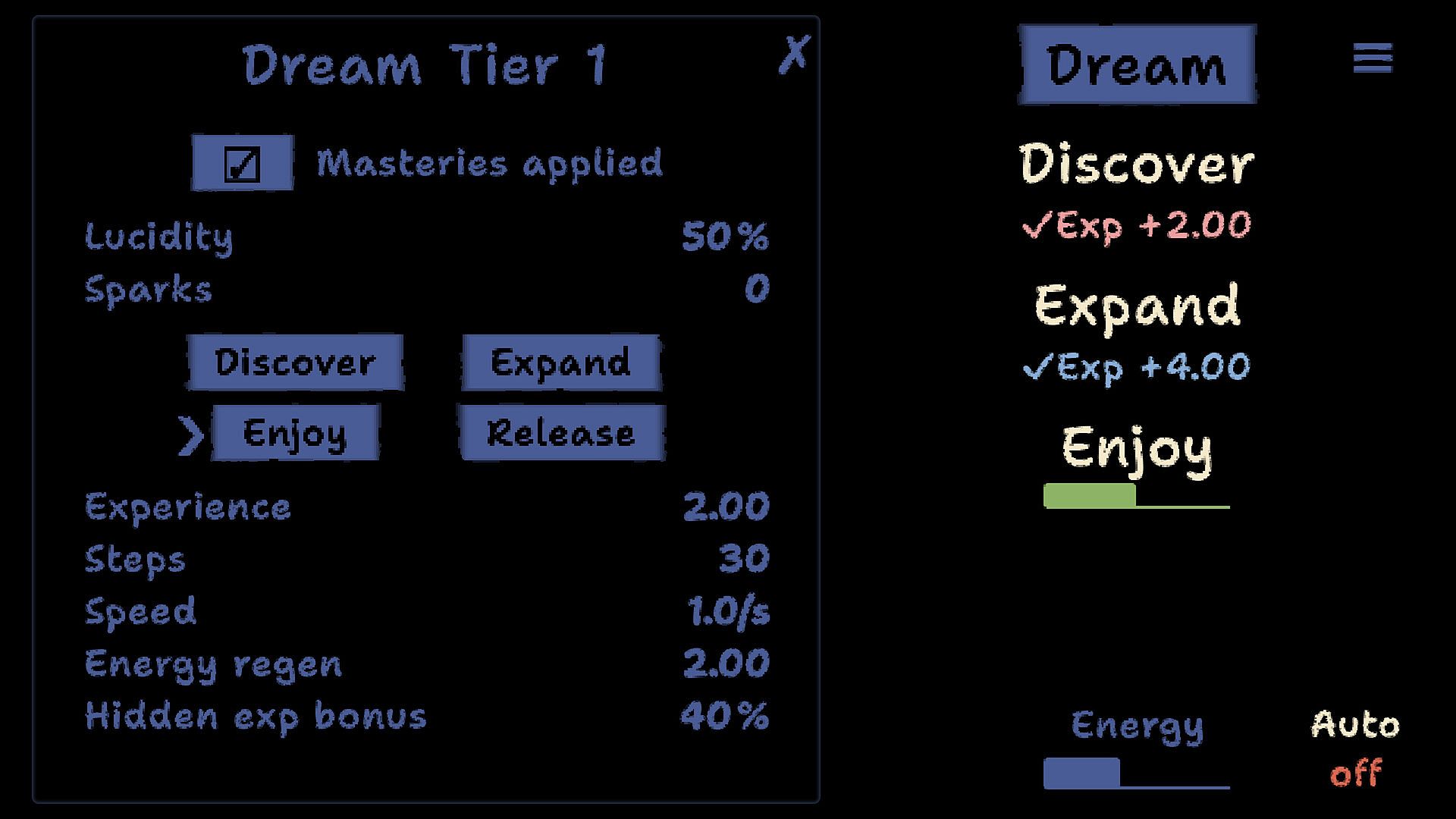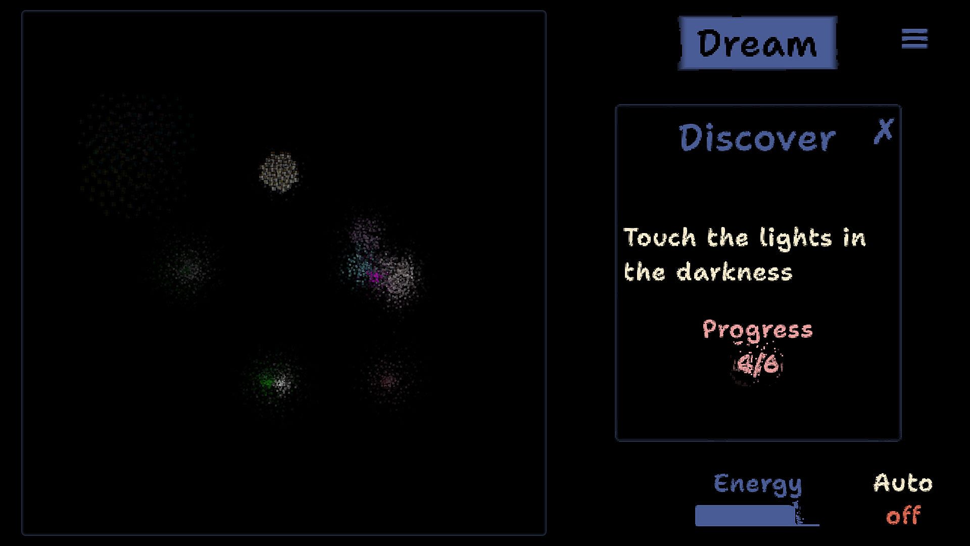 A meditative incremental experience where you interact with dreams in four phases: discover, expand, enjoy, and release. Each phase offers unique mechanics that go beyond simple clicking, requiring concentration, engagement, and optimization.