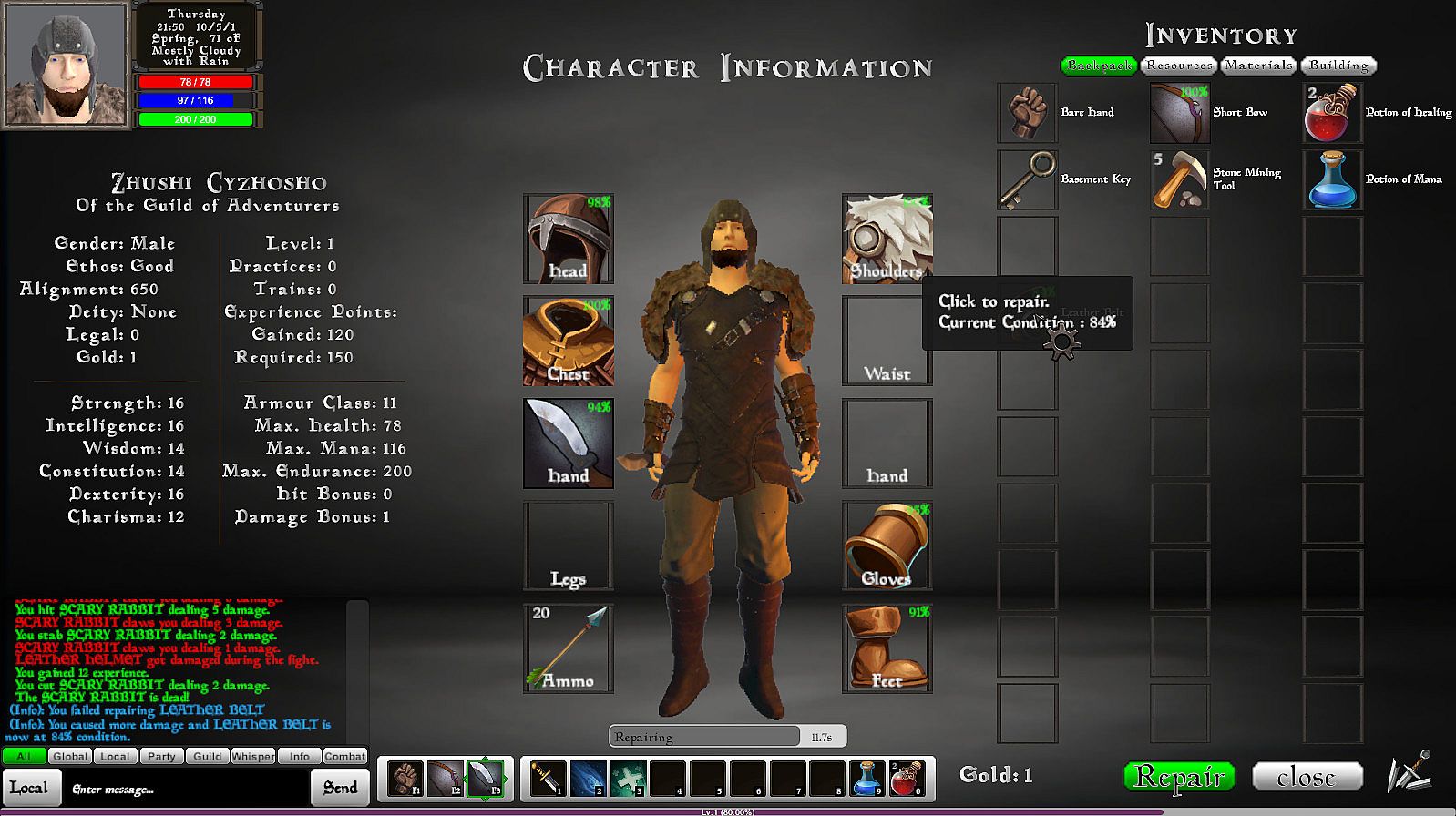 - Use the repair skill to repair armour and weapons