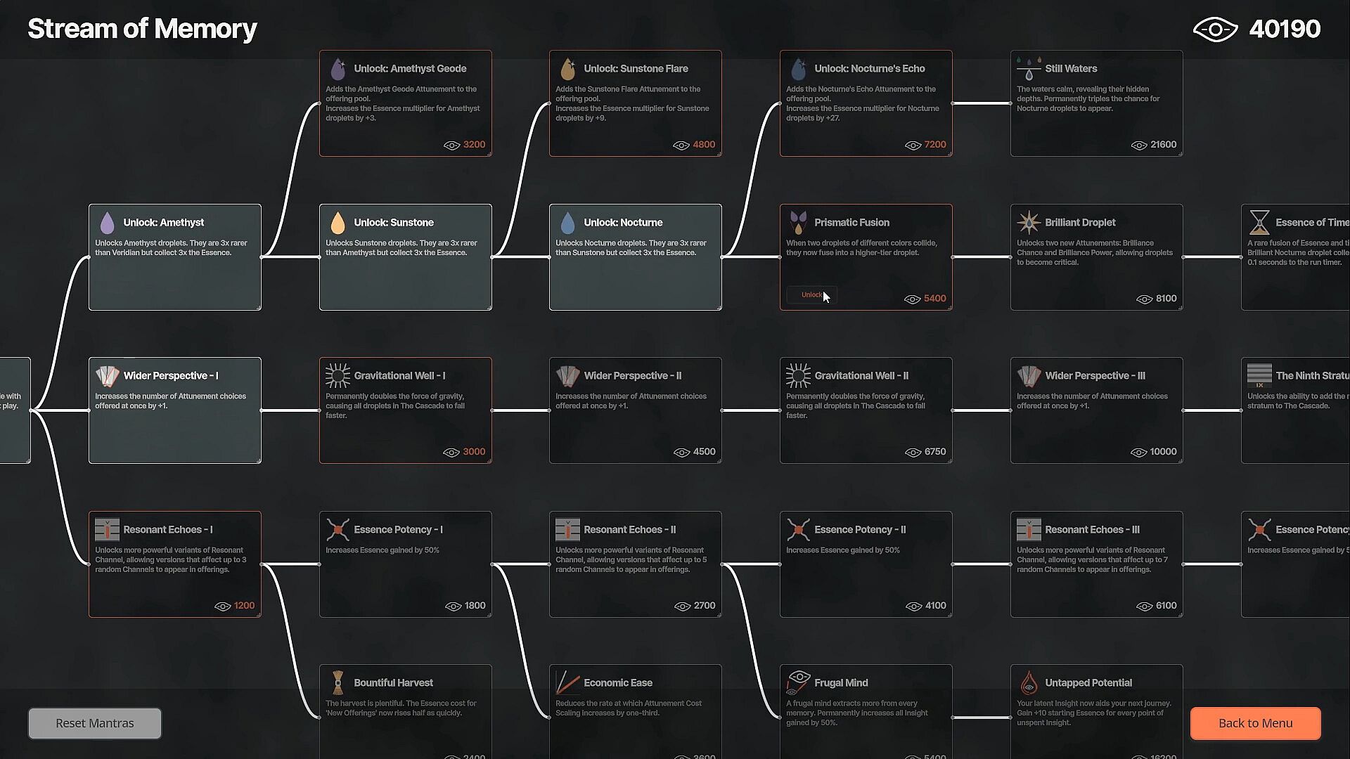 After each run, your score is converted into permanent Insight. Use it in the Stream of Memory to unlock a vast tree of game-changing Mantras. Discover new, more valuable droplet types, add deeper layers to The Cascade itself, and unlock powerful synergies and entirely new ways to play.