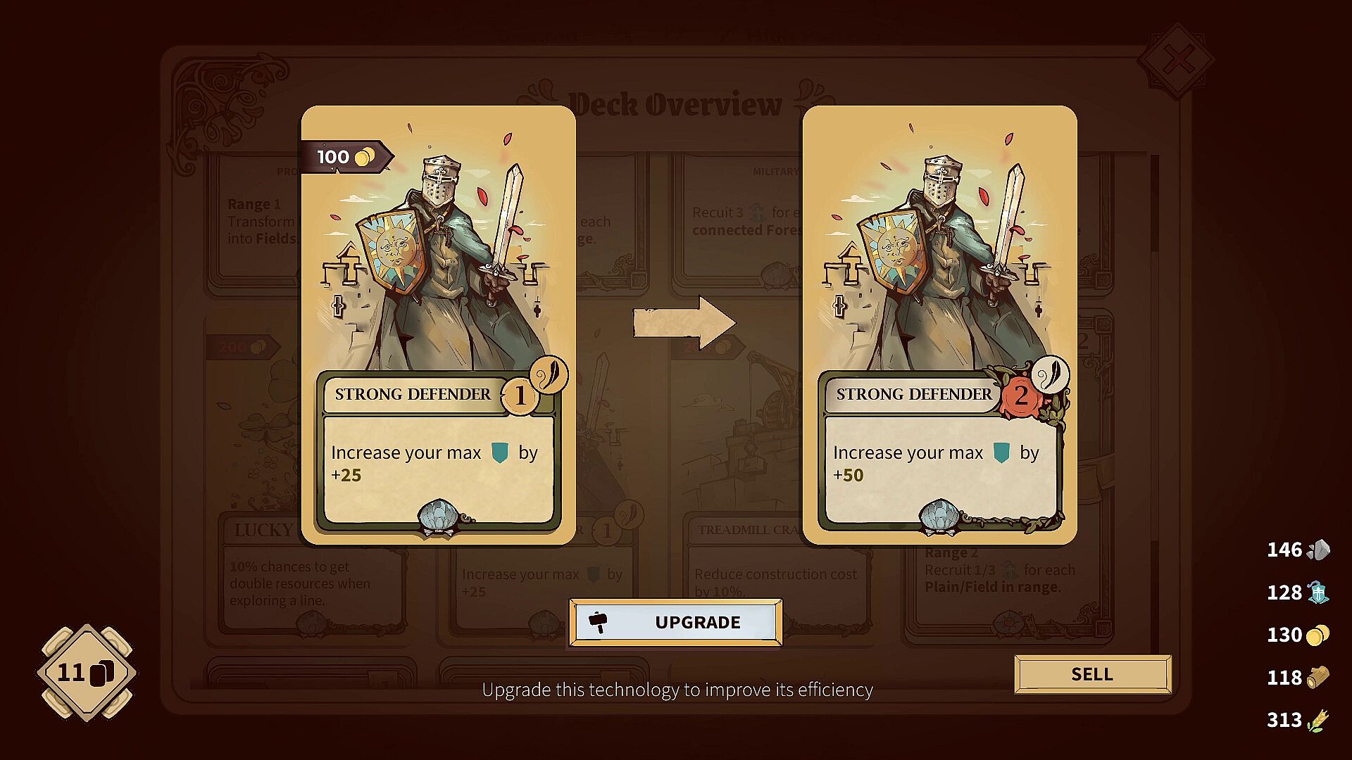 Grow in power with a rich deckbuilding system: build and enhance constructions with over 110 unique cards, each offering powerful upgrades and modifiers. Unlock new possibilities when using building or technology cards, each granting new bonus structures to boost soldier recruitment & various other perks. Customize your deck to suit your strategy and optimize your realm’s growth.