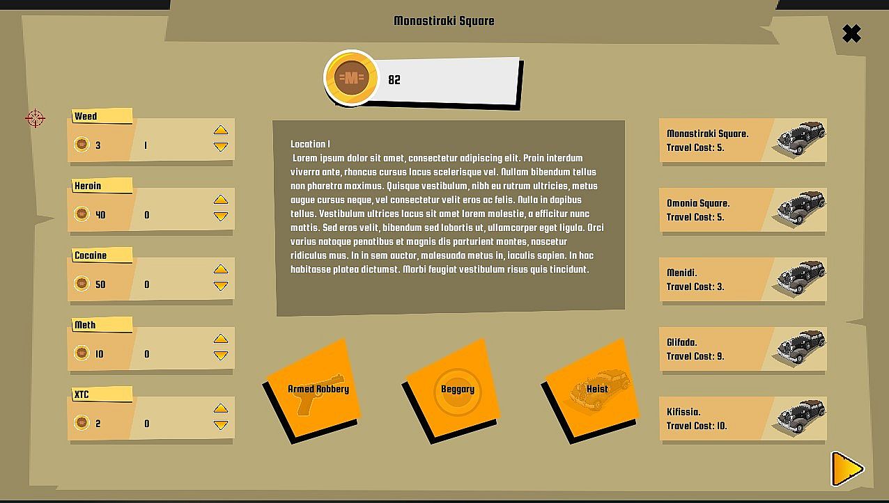While you move from one place to another, you will find yourself against random encounters that will help you get more "merchandise", make you lose it, or challenge you even more, by making you defend your life for it.