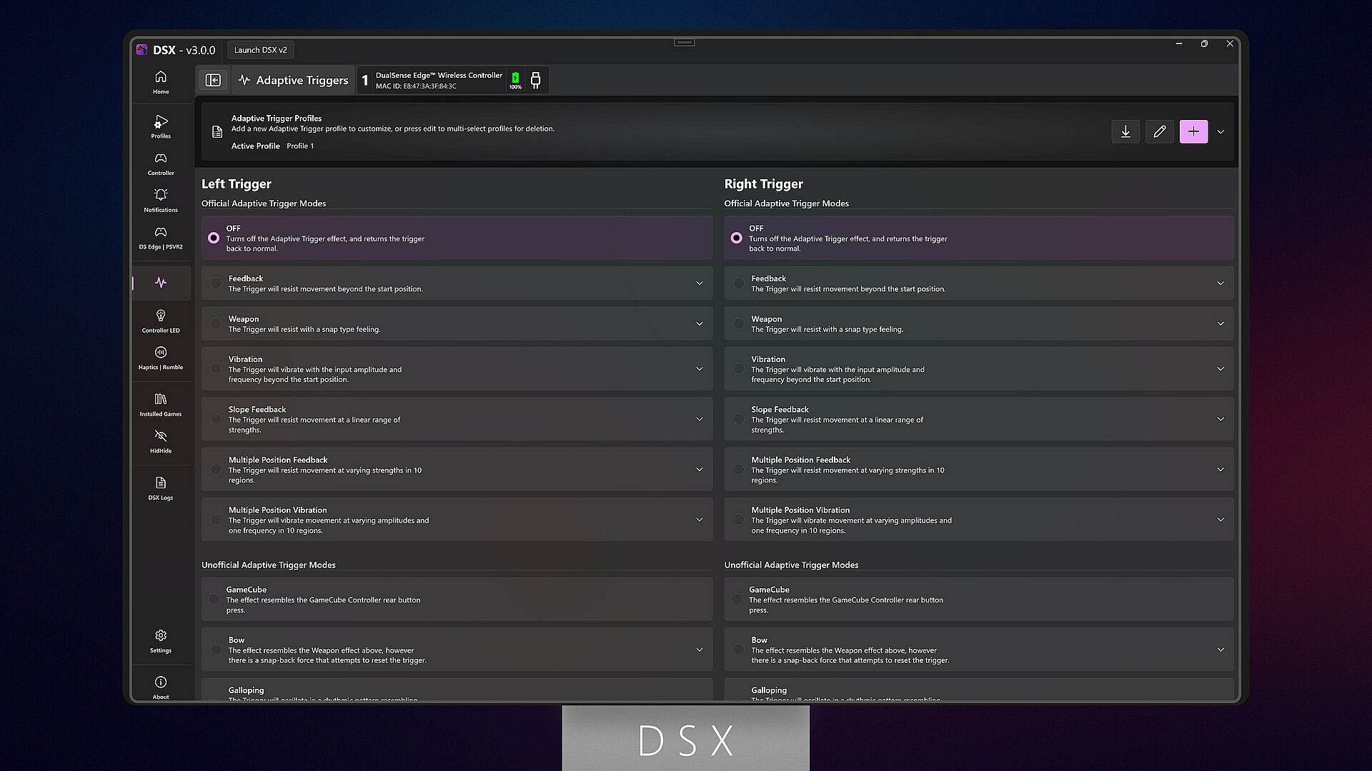 • Official Adaptive Trigger Modes: Focuses on using official Adaptive Trigger Modes that are found in natively supported games on PC, while also having legacy modes present in DSX v2.