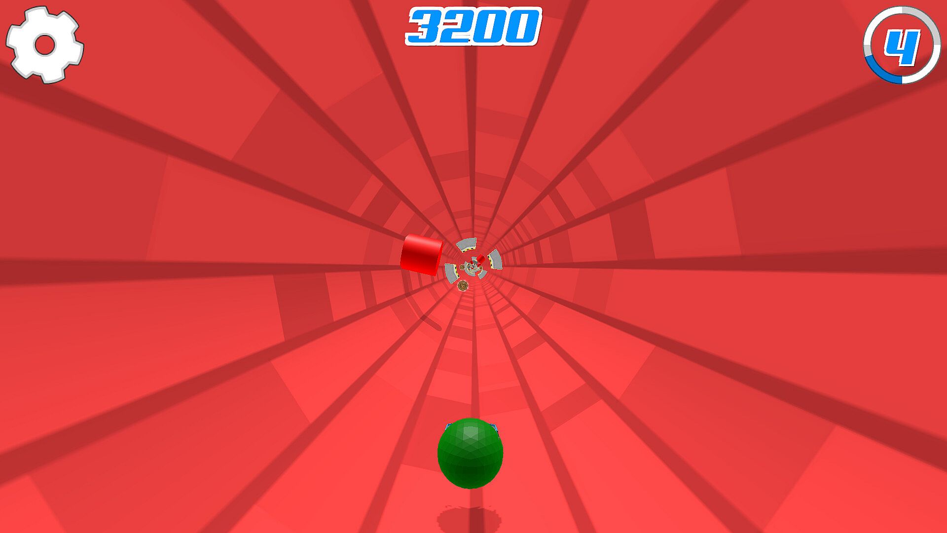 Duball Dash is a simple, hyper-casual endless runner set inside a fast-moving tube. You play as a green ball with some seriously cool white ski goggles, rolling forward and dodging metal walls with black-and-yellow hazard tape, plus plenty of red cylinders trying to ruin your run.