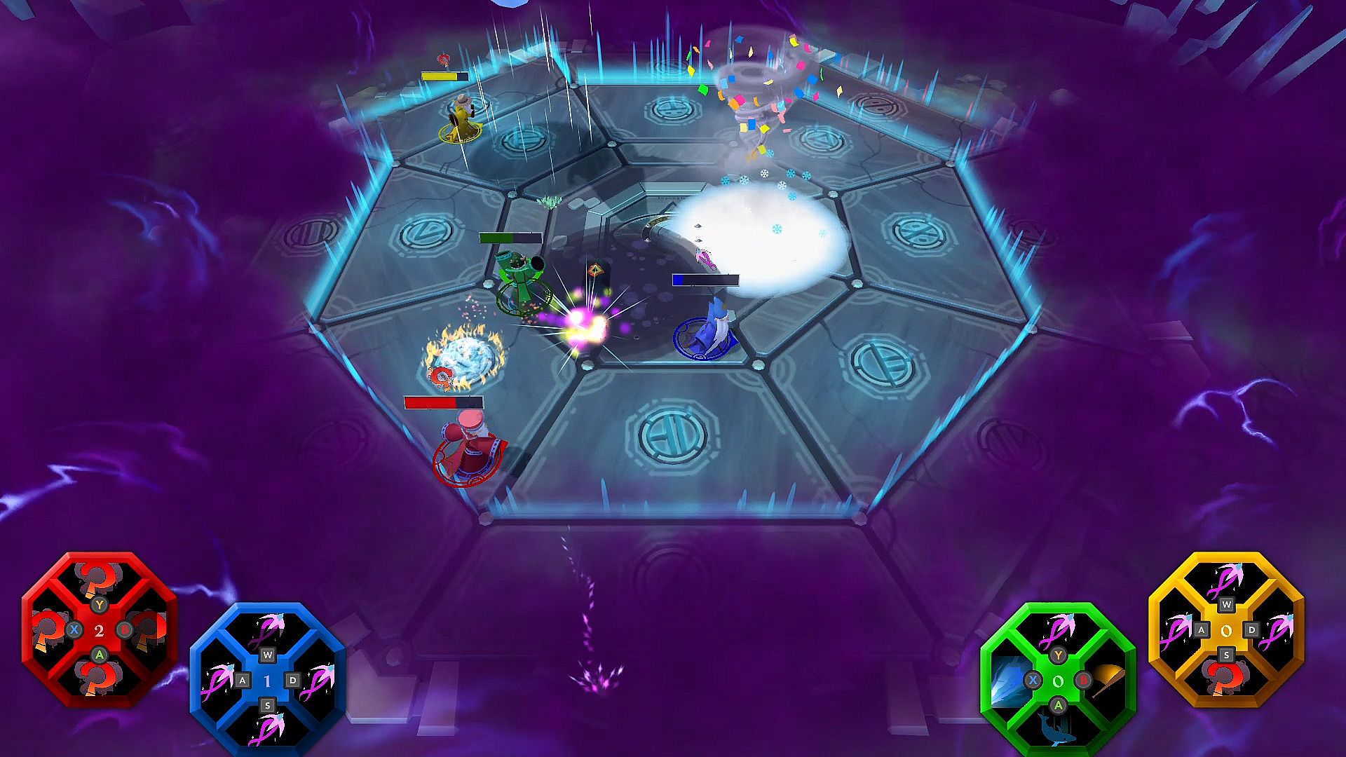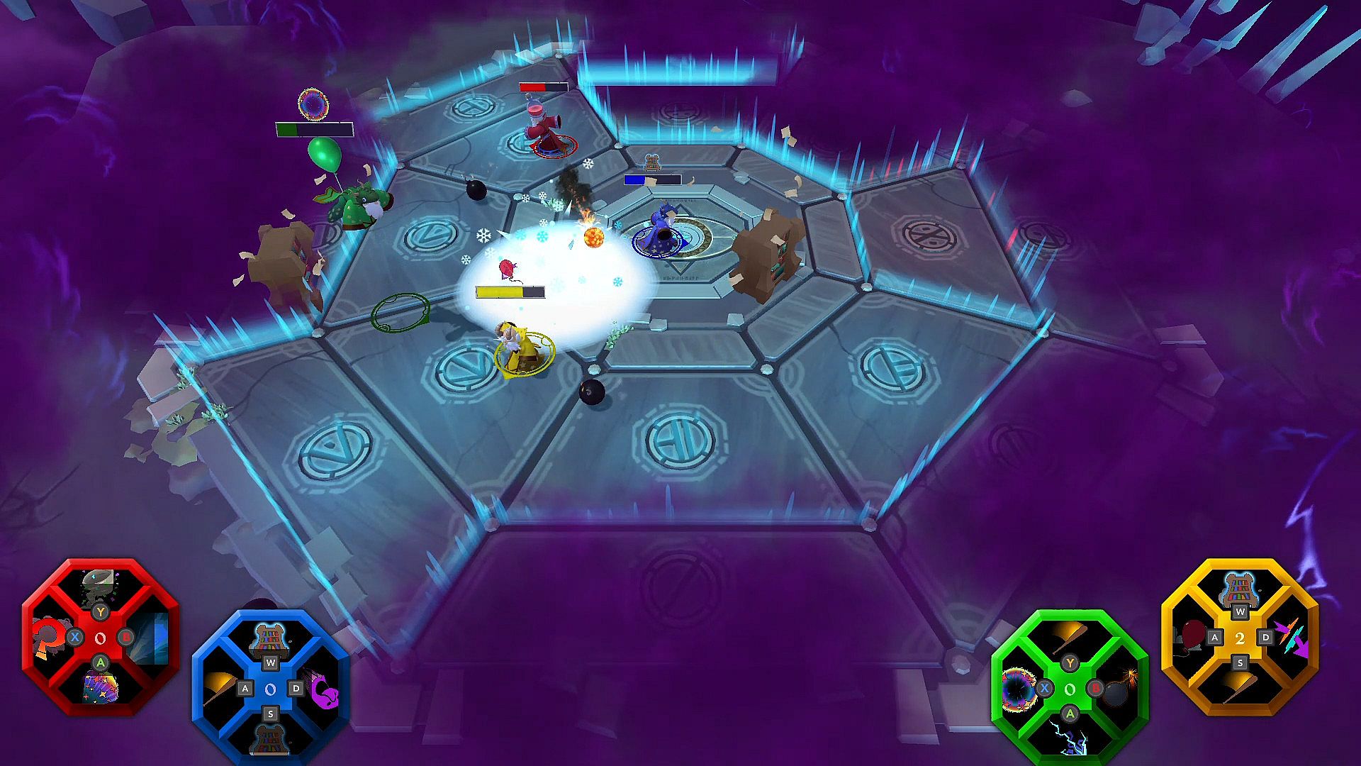 Control a wizard as you fling, whales, beach balls, chickens, fireballs and much more at your frenemies while the arena becomes smaller and smaller around you.