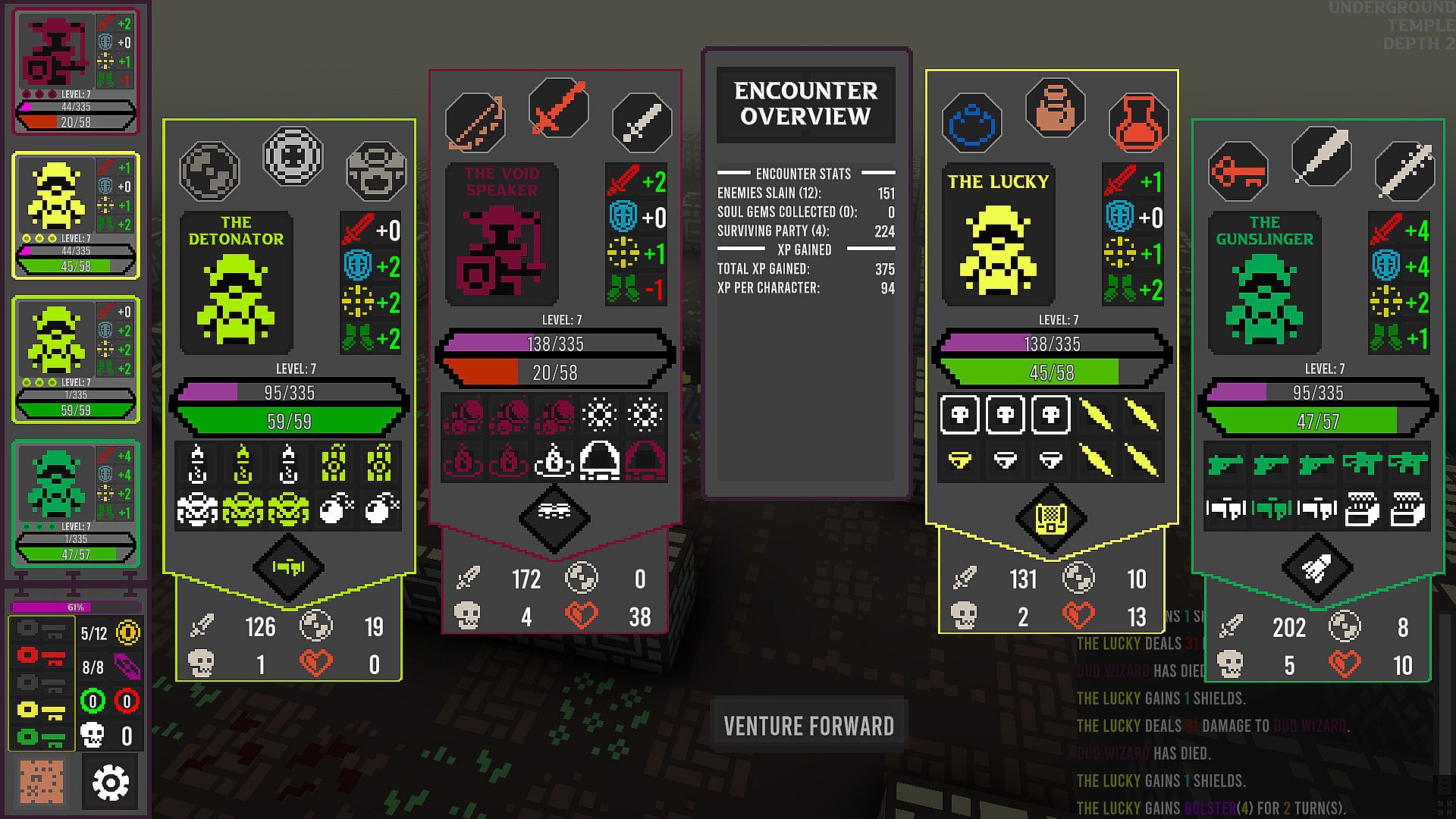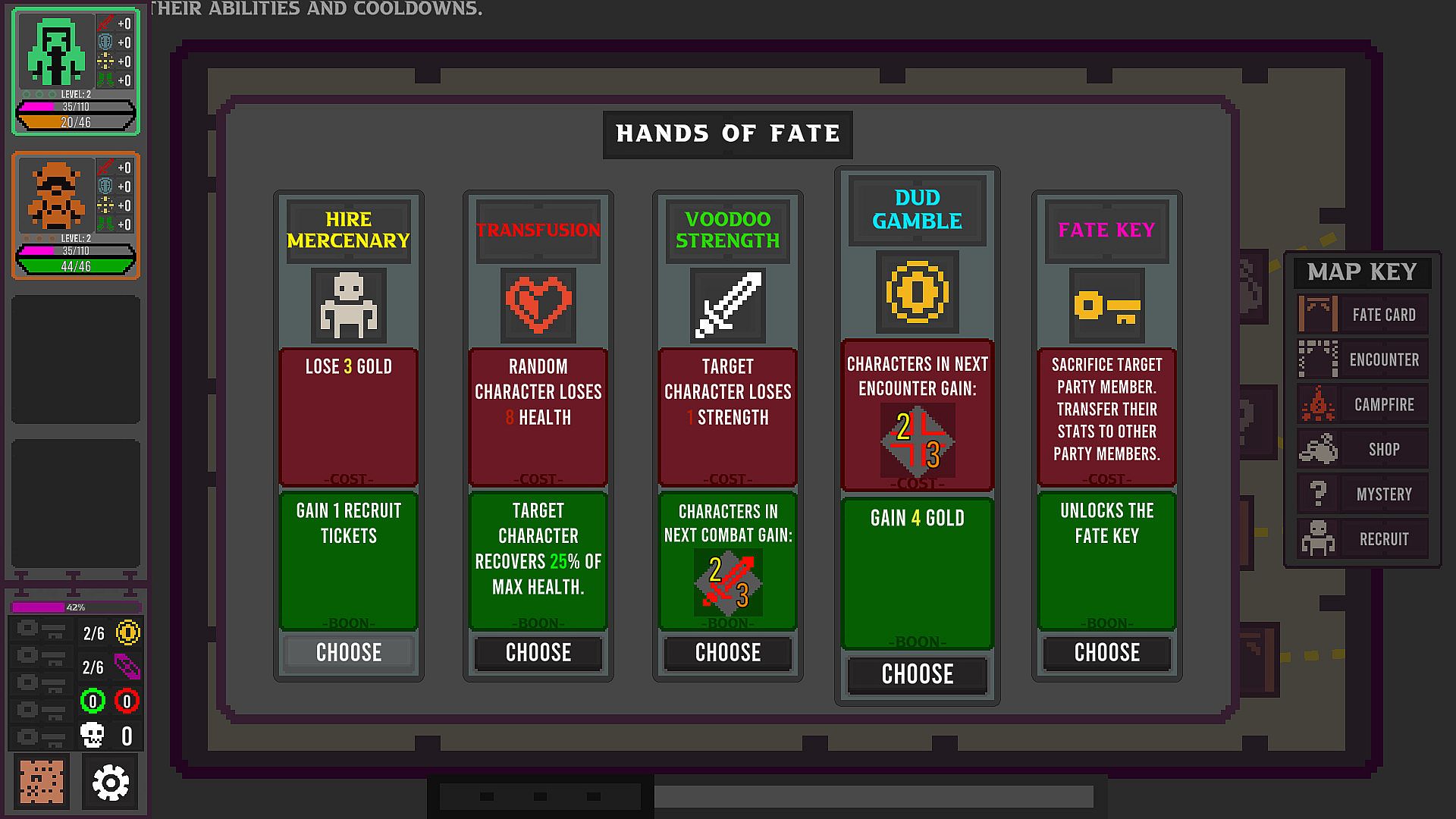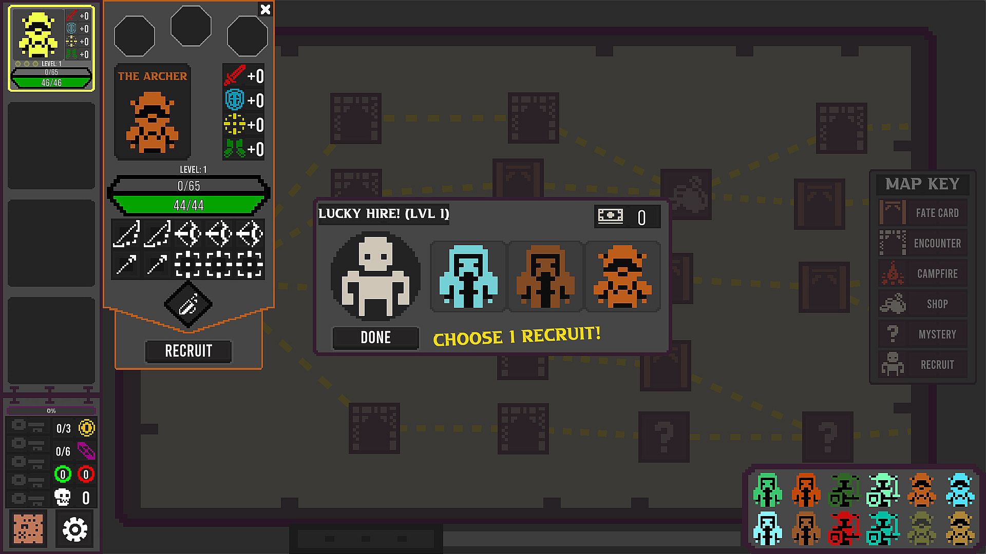 Each run of Dungeon Reels Tactics will include a pool of 12 different characters you can recruit throughout the adventure. To gain new recruits you will need to collect soul shards from fallen foes, resolve fate cards, or purchase recruit tickets in the shop. If a party member falls in battle they will die and you will need to recruit a party member for the adventure.
