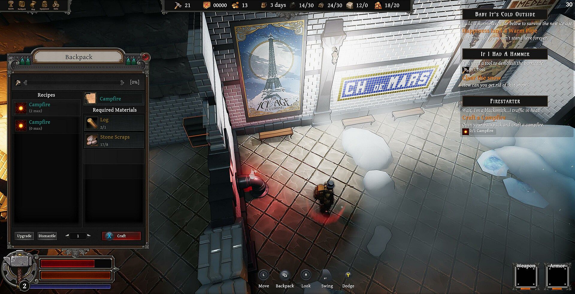 Travel across the map to explore forgotten underground locations that exist between the freezing surface and the molten heat bubbling up from below. Play sources against each other to balance and manage temperature, pollution, light, and technology to create livable spaces. Find and craft equipment, gear, tools, and weapons to help you survive. Gain experience and choose skills and perks when leveling up to be able to survive deeper, darker places.