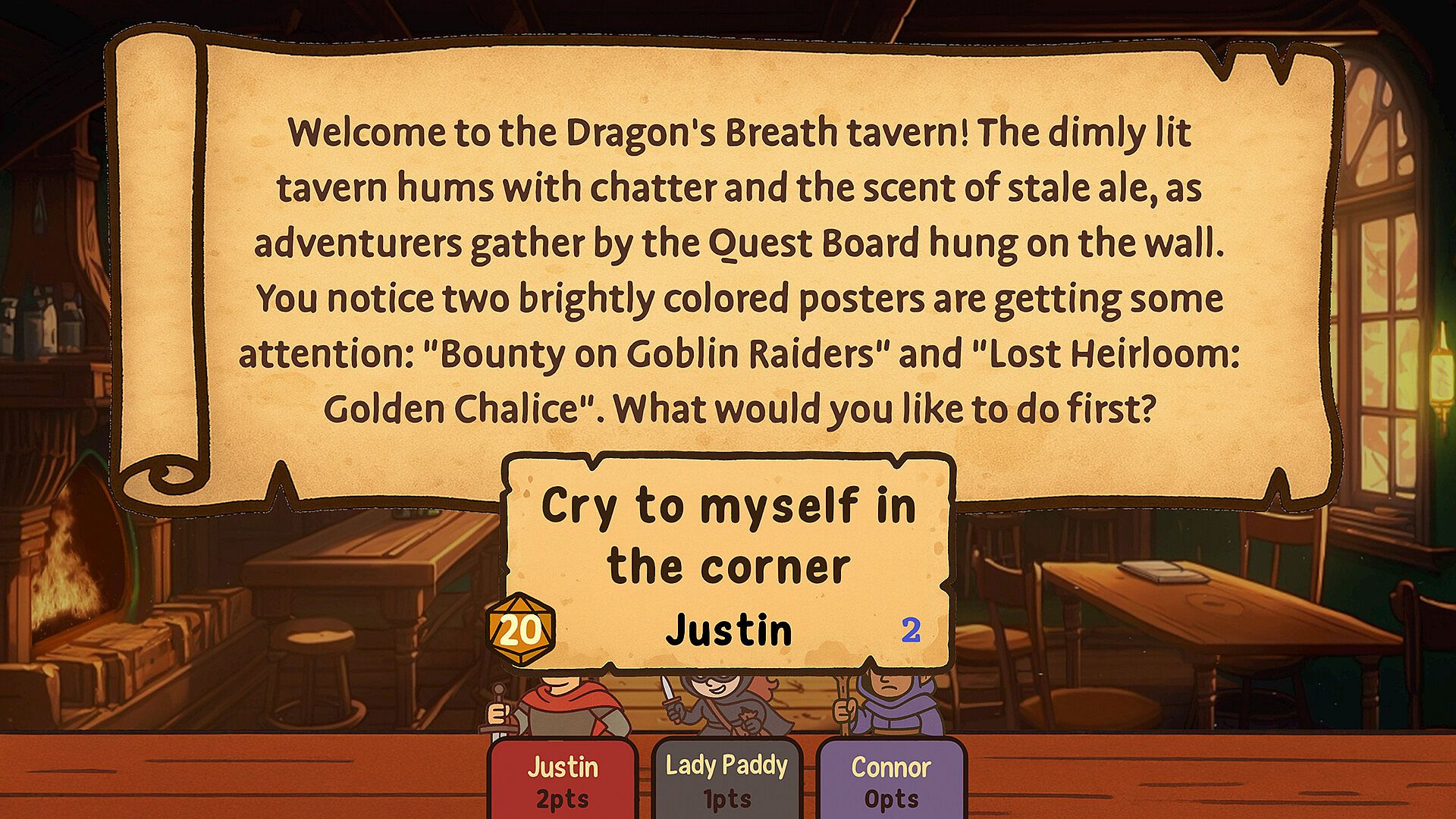 Vote-driven storytelling & dice – Shape the narrative together, then test fate with digital d20s and cheeky items like Gold Dice or Potions of Confusion.