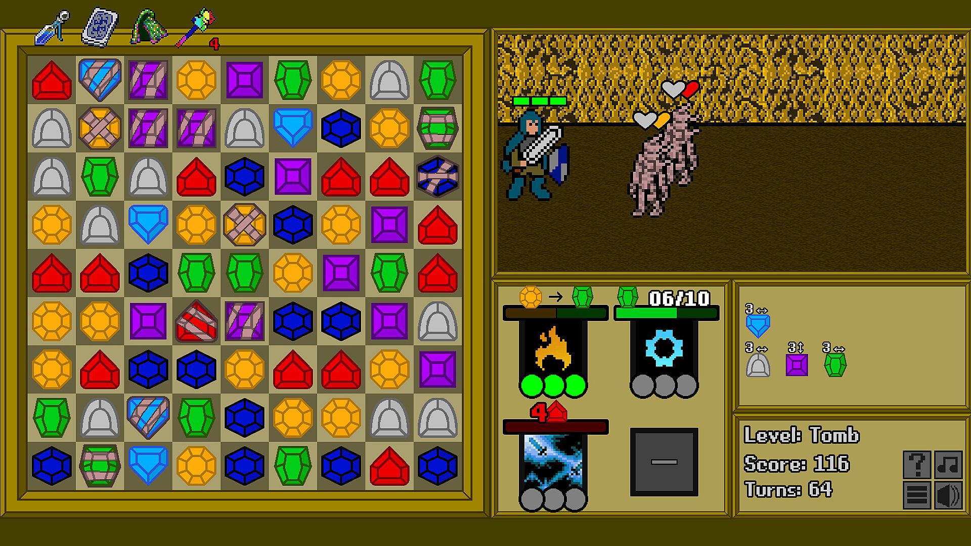 Delve deeper into the dungeon. Become stronger - unlock powerful spells and gamechanging relics, with every run offering a variety of build options and synergy potential. Fight monsters and use your abilities by matching tiles, chaining combos, and solving puzzles.