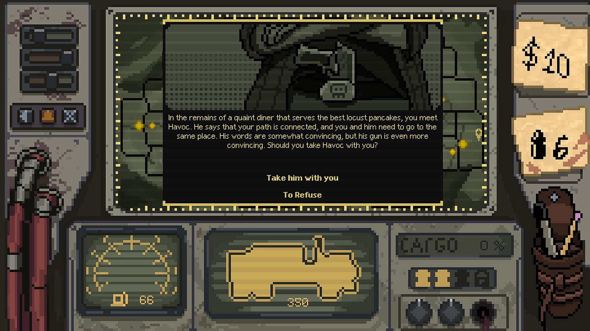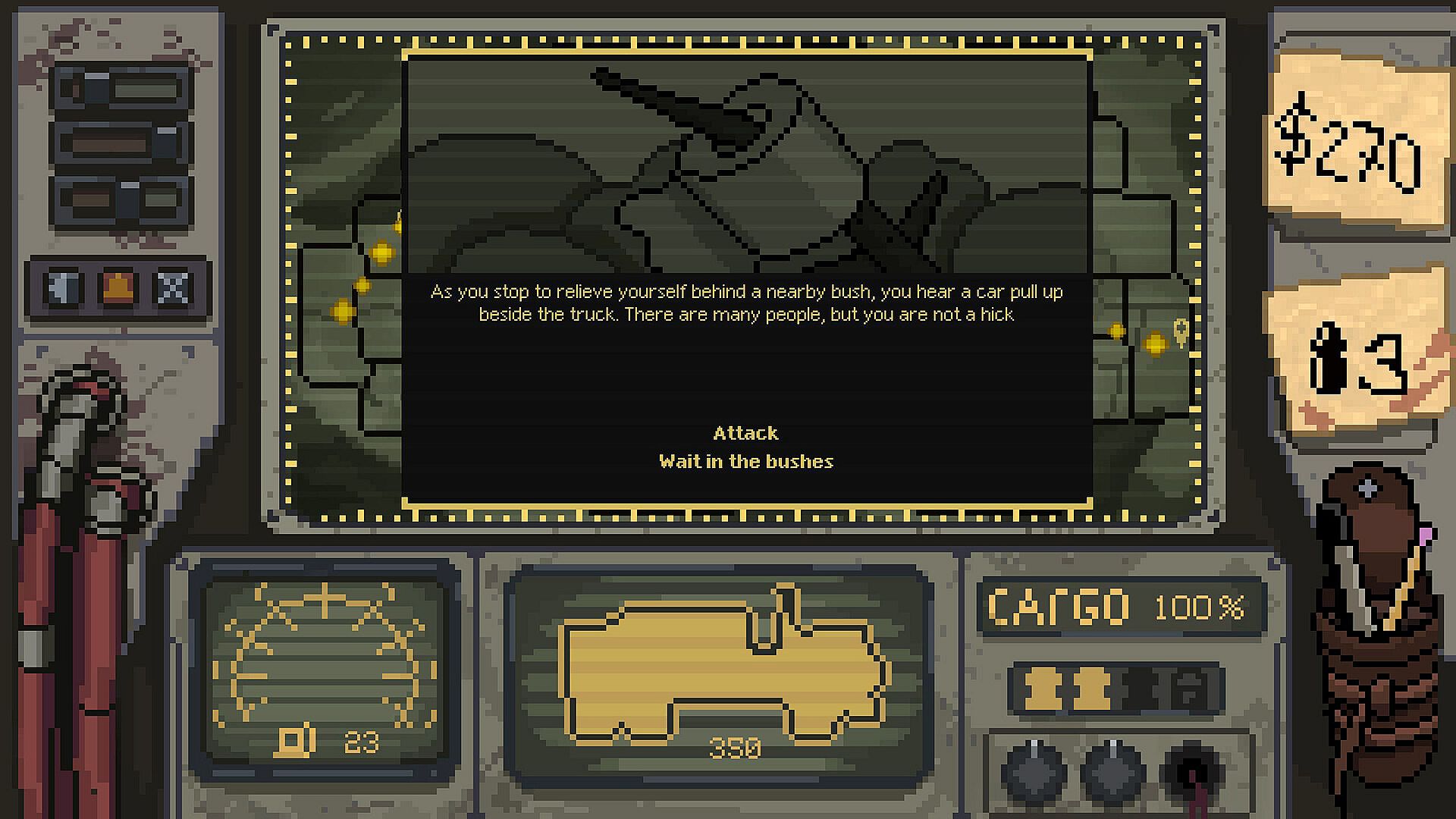 A text-based game with resource management elements set in a post-apocalyptic world. Your task is to plan a route and deliver cargo safely, all while participating in unique events with various outcomes.