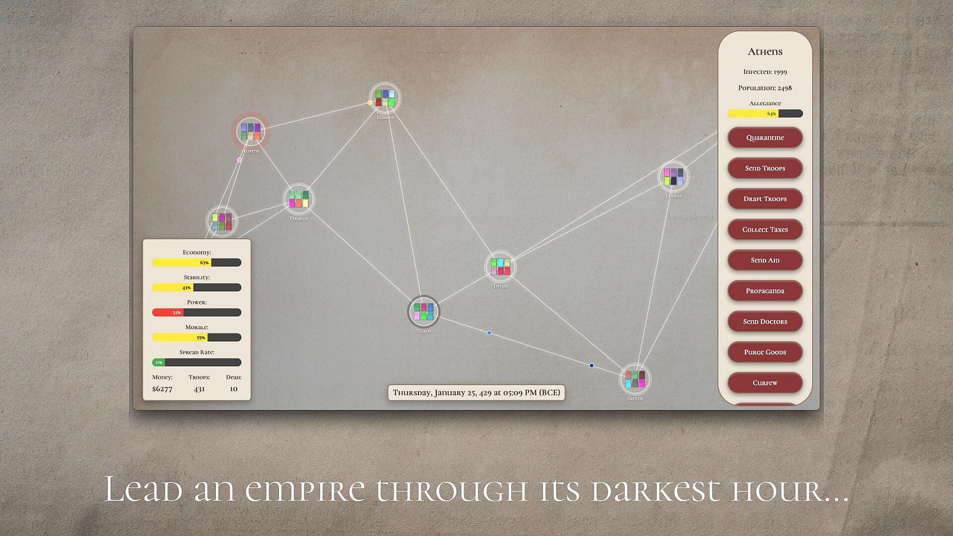 Keep your empire from collapsing by balancing your empire's stats. Every decision affects your empire differently, and managing these interconnected systems is the key to survival.