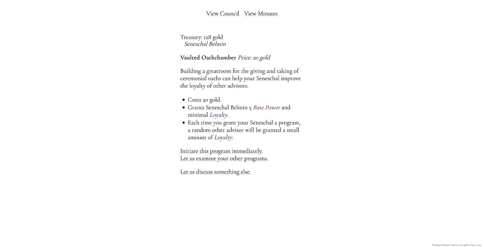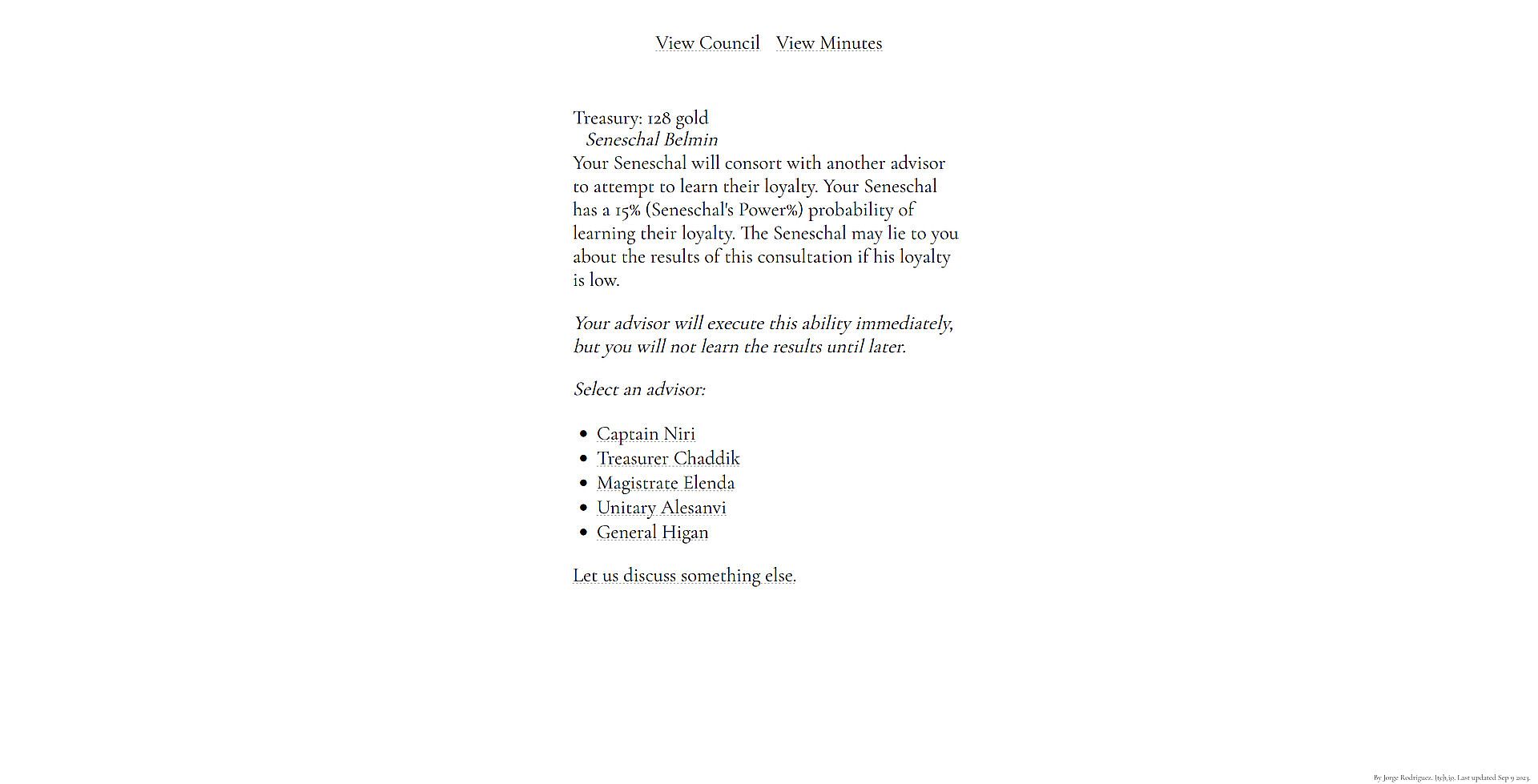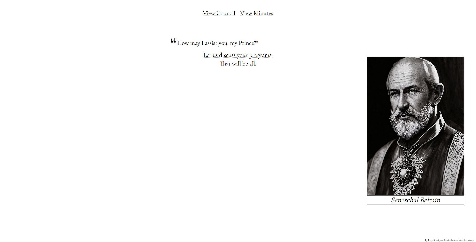 - Seneschal Belmin: The majordomo of your palace. Through him you can curry the loyalty of your other advisors. He can help you expand your palace and staff, and with enough power can learn the true loyalty of your other advisors.