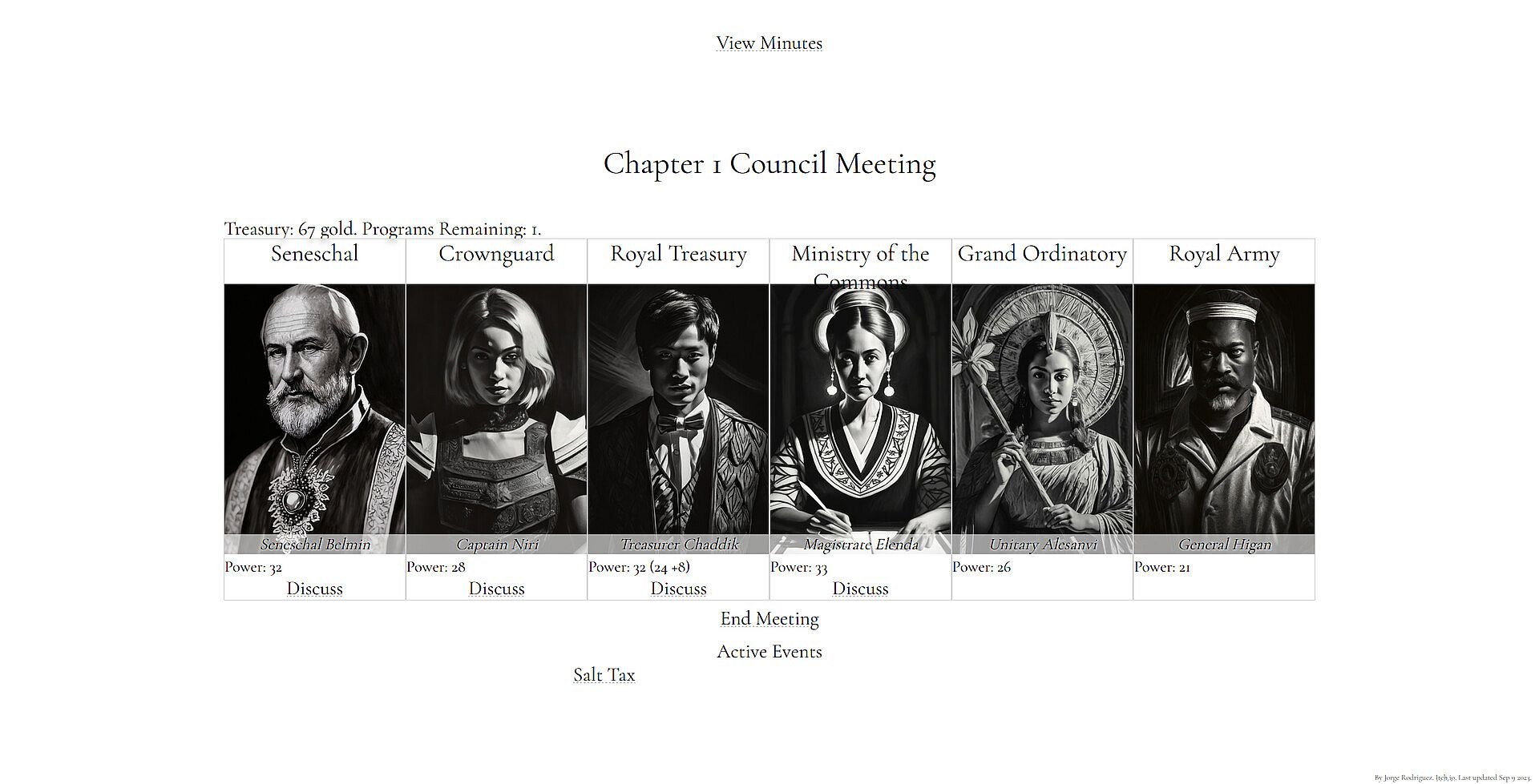 Dynasty is a social deduction roguelike in which you must rule your kingdom through your advisors, who you are unsure whether you can trust. Your advisors hold the keys to power. You must please them enough to keep them loyal and grant them the power to administrate your kingdom. But beware-- the more power you grant them, the more they may use that power against you. You must survive 30 turns without being assassinated. If you have not been assassinated by your advisors by turn 30, you win.