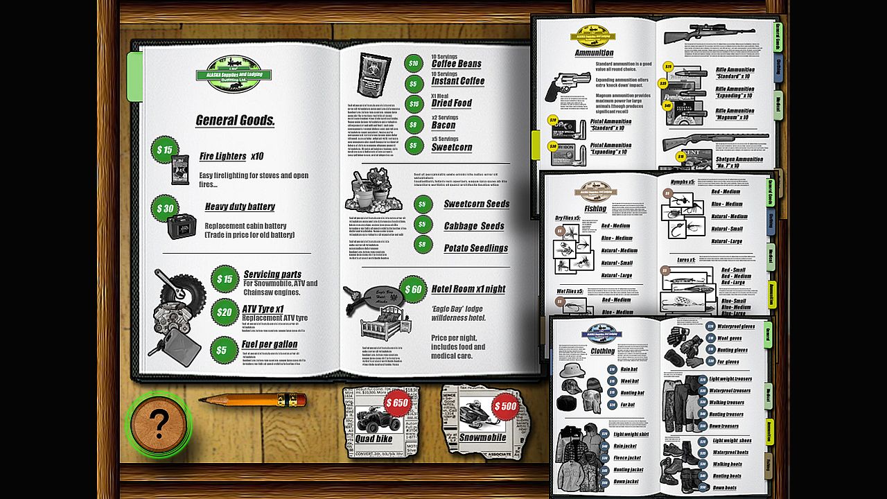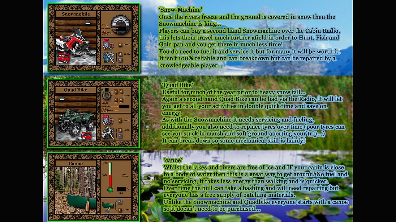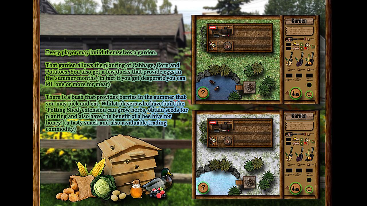 Simulating Homesteading and Survival in your own log cabin deep in the Alaskan wilderness. You choose a location in the Alaskan wilderness to build your cabin... The cabin is built and kitted out with much of the equipment you need to survive The trick is to create a sustainable routine to keep yourself alive from thereon. You choose tasks to undertake, from Gold panning, Fishing and Hunting to tree felling, cooking and foraging. Each task takes a 'real' (and realistic) amount of time to complete, On completion the outcome is relayed in a narrative style in your Cabin 'task journal',Each new day a 'diary journal' is created that describes additional events that may have befallen you since the previous day.