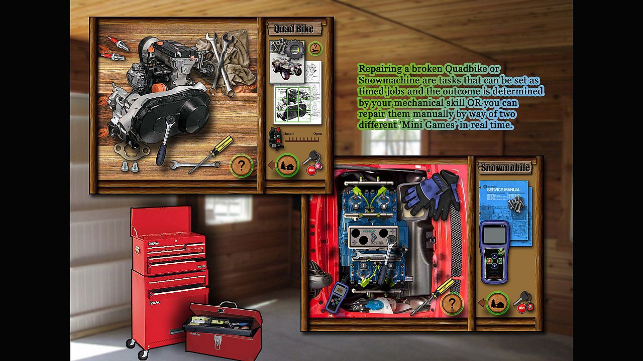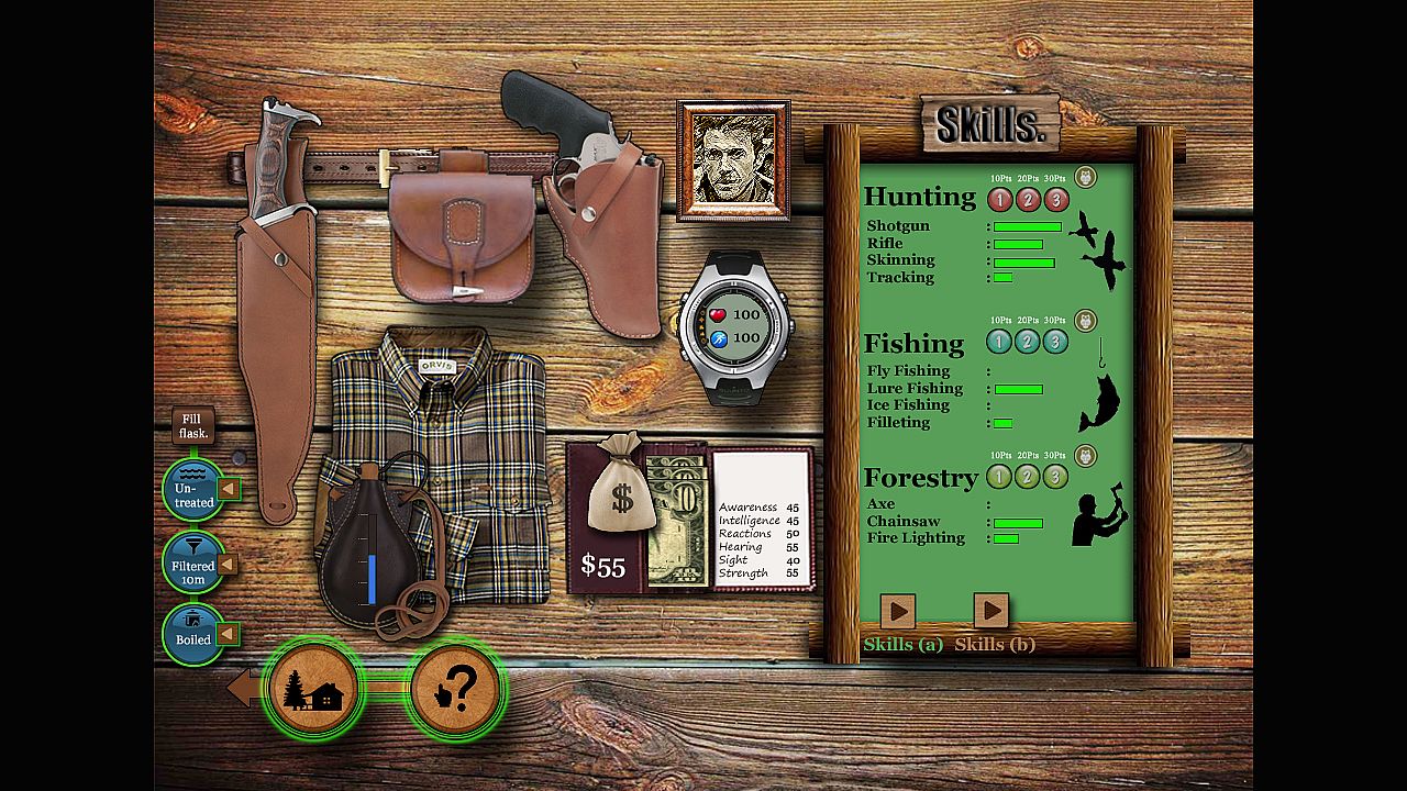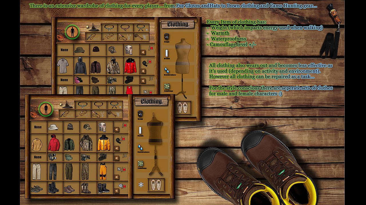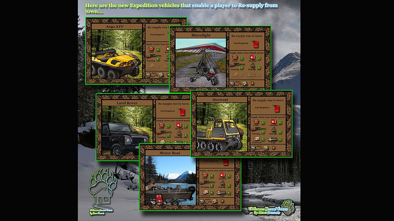 Simulating Homesteading and Survival in your own log cabin deep in the Alaskan wilderness. You choose a location in the Alaskan wilderness to build your cabin... The cabin is built and kitted out with much of the equipment you need to survive The trick is to create a sustainable routine to keep yourself alive from thereon. You choose tasks to undertake, from Gold panning, Fishing and Hunting to tree felling, cooking and foraging. Each task takes a 'real' (and realistic) amount of time to complete, On completion the outcome is relayed in a narrative style in your Cabin 'task journal',Each new day a 'diary journal' is created that describes additional events that may have befallen you since the previous day.