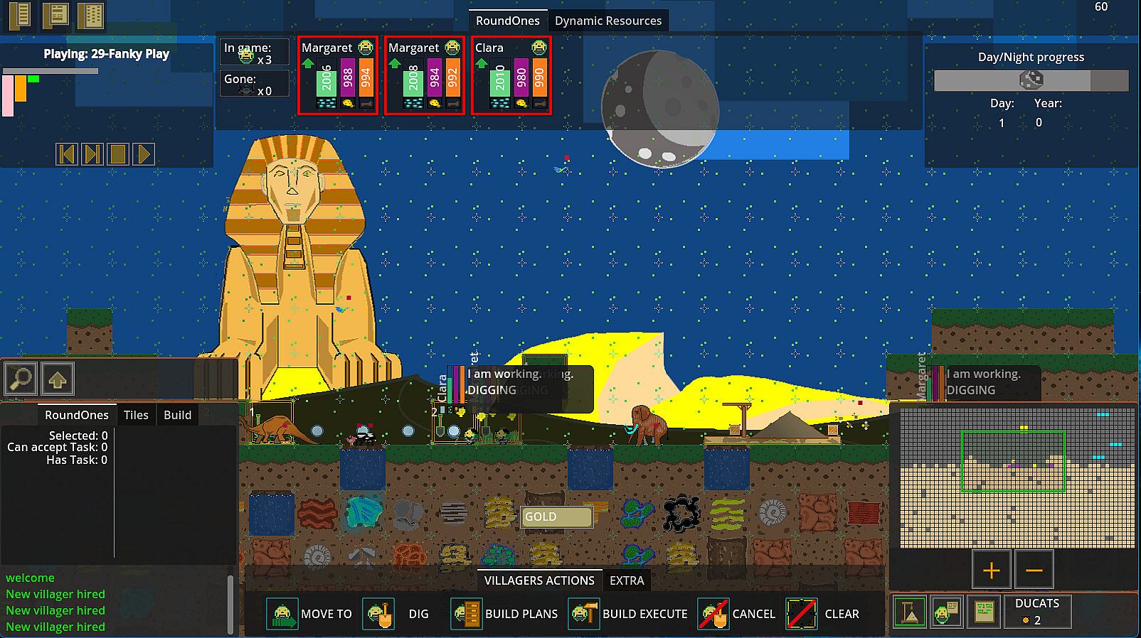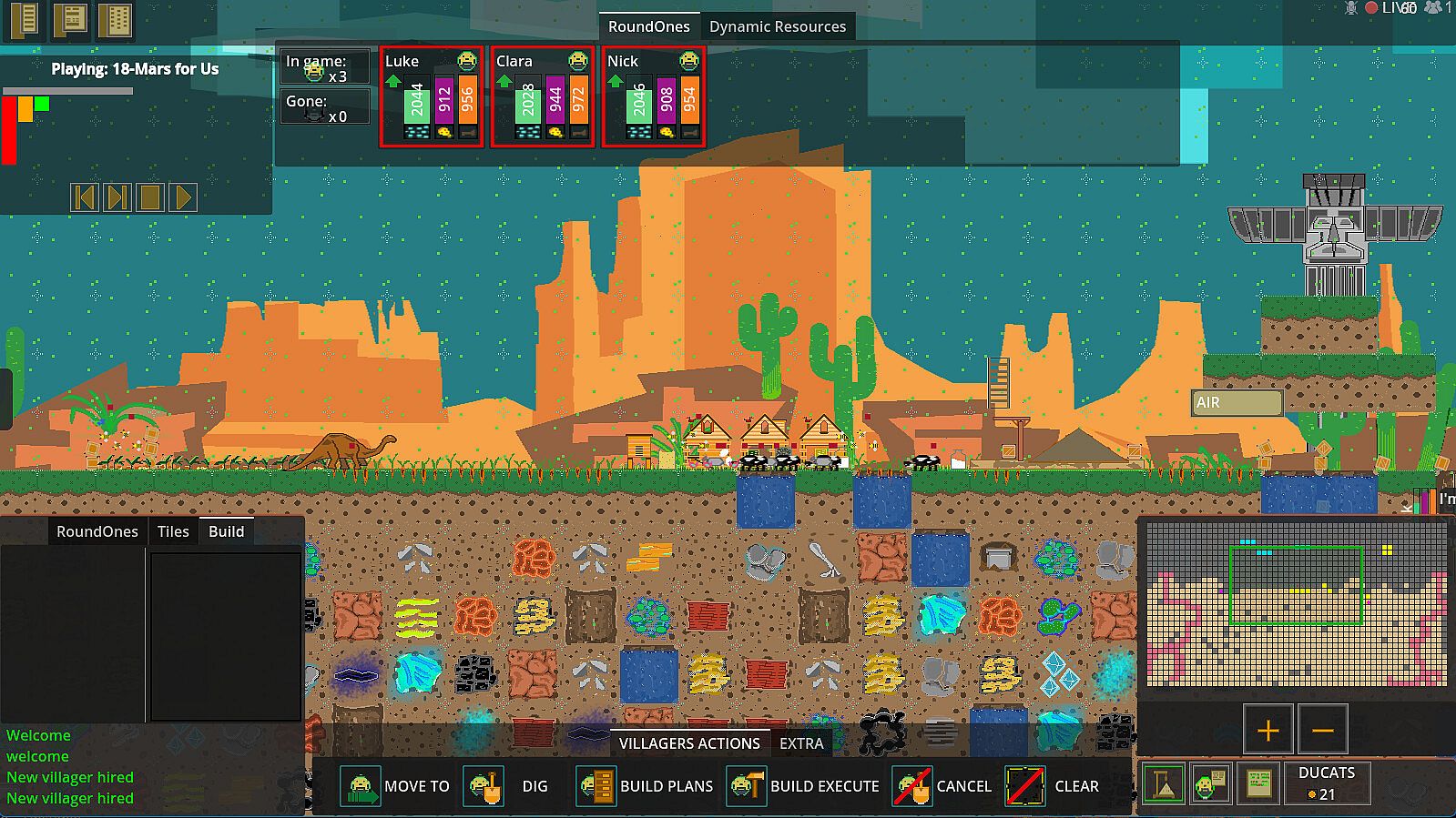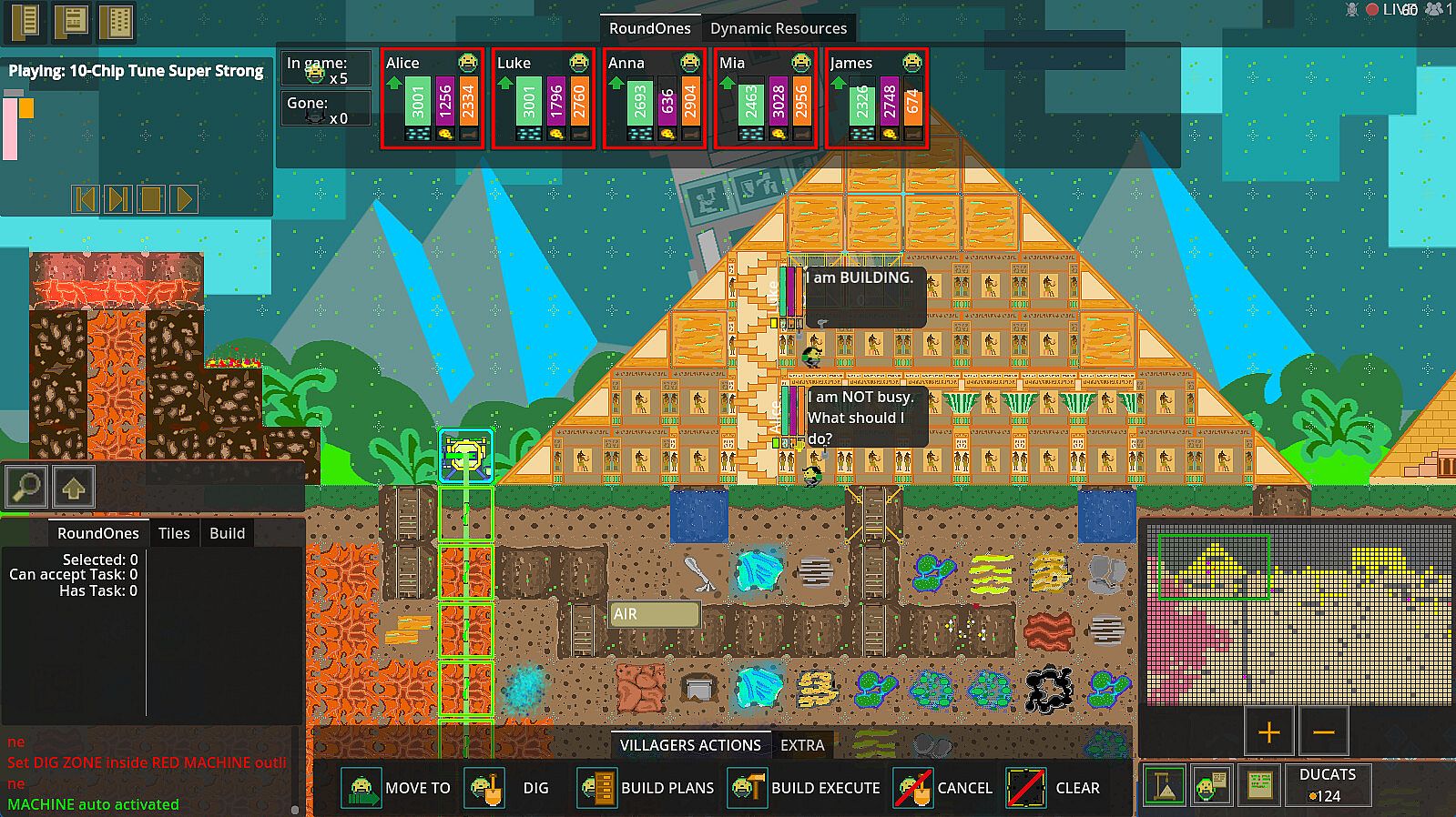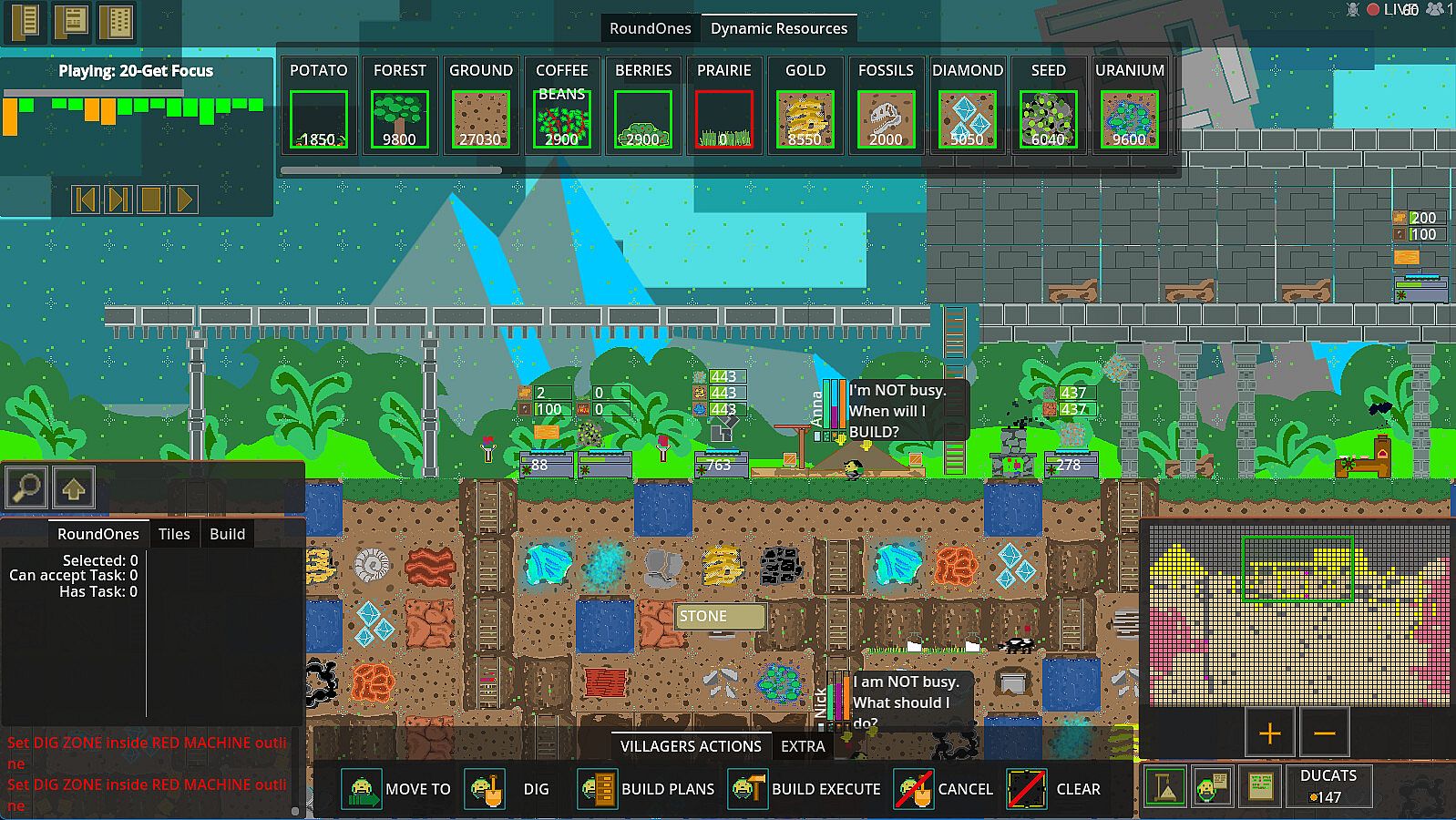 You play with group of game characters RoundOnes. They will collect resources and use them to BUILD up theirs world. To get resources RoundOnes simply can dig tiles in game called Elements . Every tile on map with some effort could be accessible to digging. While digging RoundOnes earn DUCATS which they could use for upgrades. Next they can mix Elements in MIXERS, BUILD improvements on map to easier access more tiles, use MACHINES which will speed up process of digging.