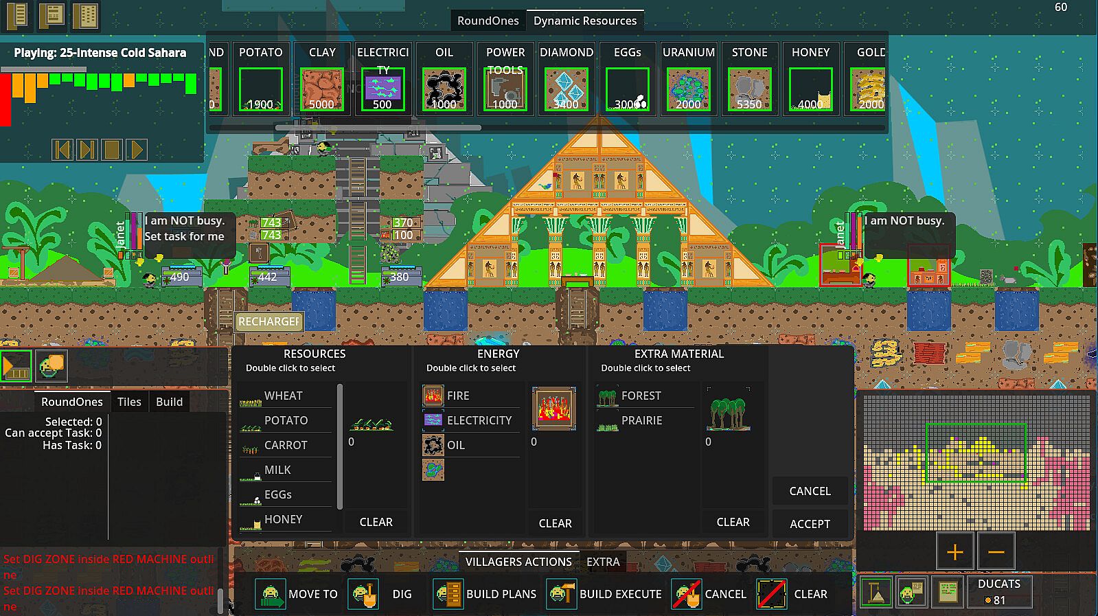 Command RoundOnes to dig map tiles called Elements, gathering resources and Ducats for upgrades in this PC strategy game. Mix Elements in mixers to craft advanced tools, build improvements like ladders and walls for better access, and deploy machines to accelerate digging. Manage food and sleep levels with beds and tables to keep health up, while progressing from basic builds to monumental wonders like Stonehenge or custom creations. Unlock surprises such as Yeti from permafrost, Mammoths, Dinosaurs via DNA rebonders, or Droids from computer chips, alongside over 40 unique tiles and more than 100 builds. Randomly generated maps support varied playstyles with three character types-RoundOne, Yeti, Droid-and animal management options. Non-linear paths and session lengths from 30 minutes to hours appeal to players who crave freedom and replayability in resource-driven strategy.