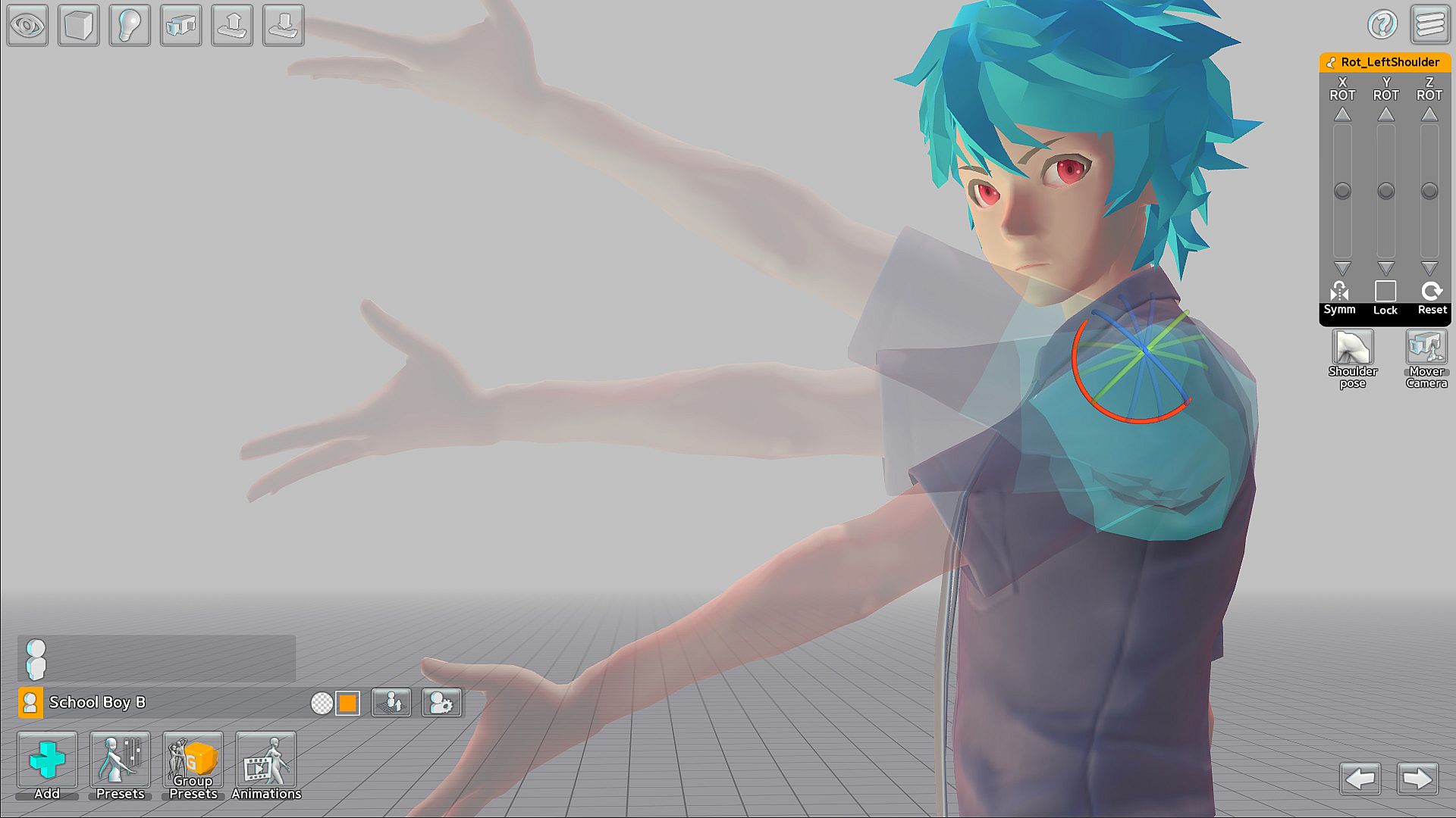 1. Easy Pose enables control over every human joint in a delicate and convenient way. Create poses in a manner that suits your taste by using the 3D gizmo and slide panel tools offered by the app. It is equipped with various functions that were not available in the existing pose apps, such as providing highlights on movable parts, initializing each joint, and utilizing symmetrical poses by taking advantage of the mirroring function.
