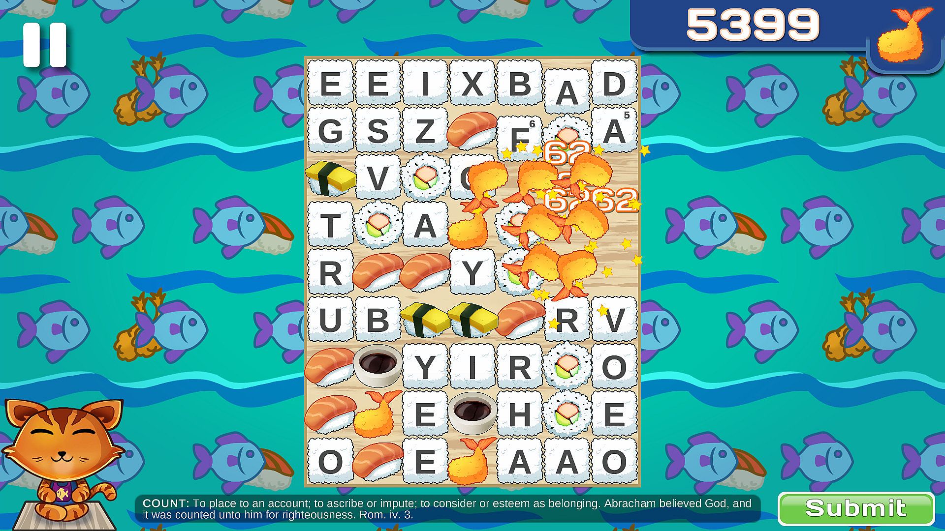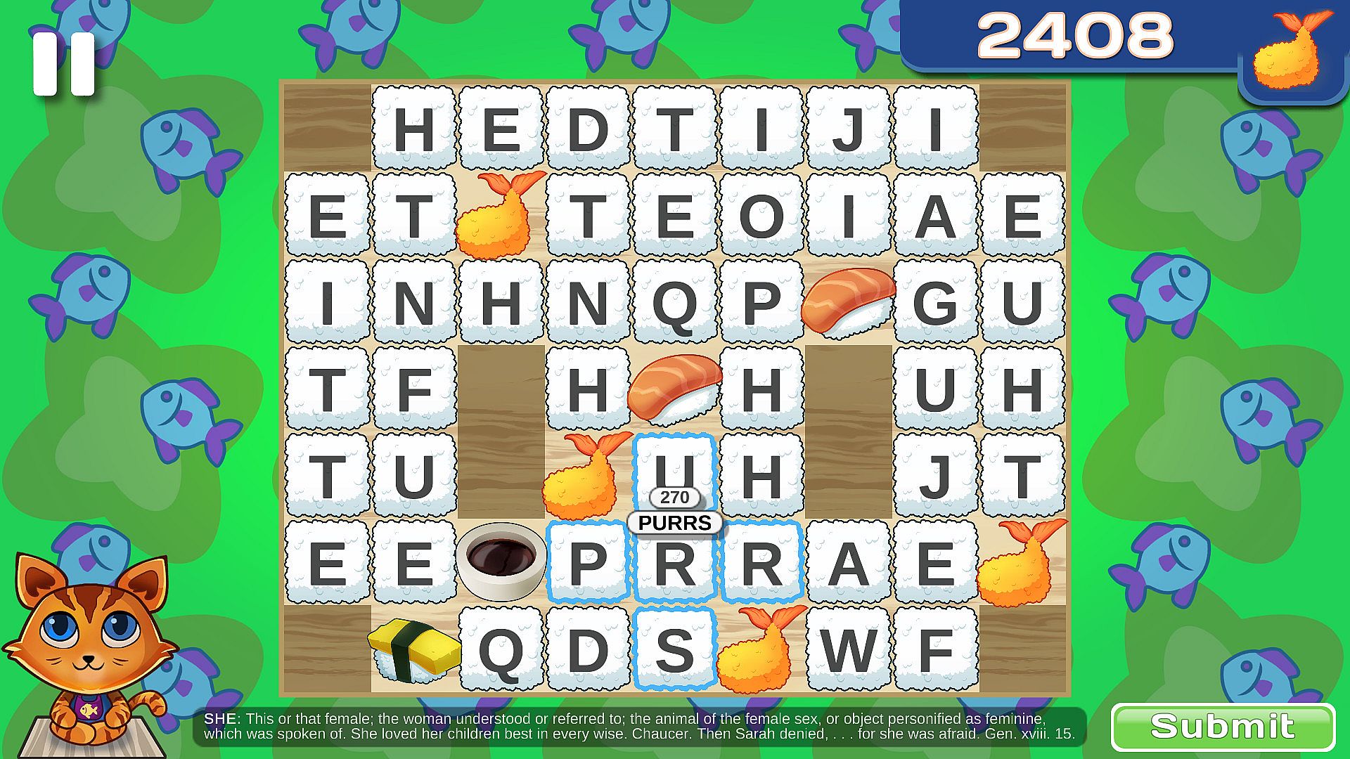 The goal of the game is to find as many words as you can on the game board. Each word must be at least 3 letters, and you can't use the same word twice. Every word generates sushi pieces. Match 3 sushi pieces to clear them off the board. There are four modes of play: