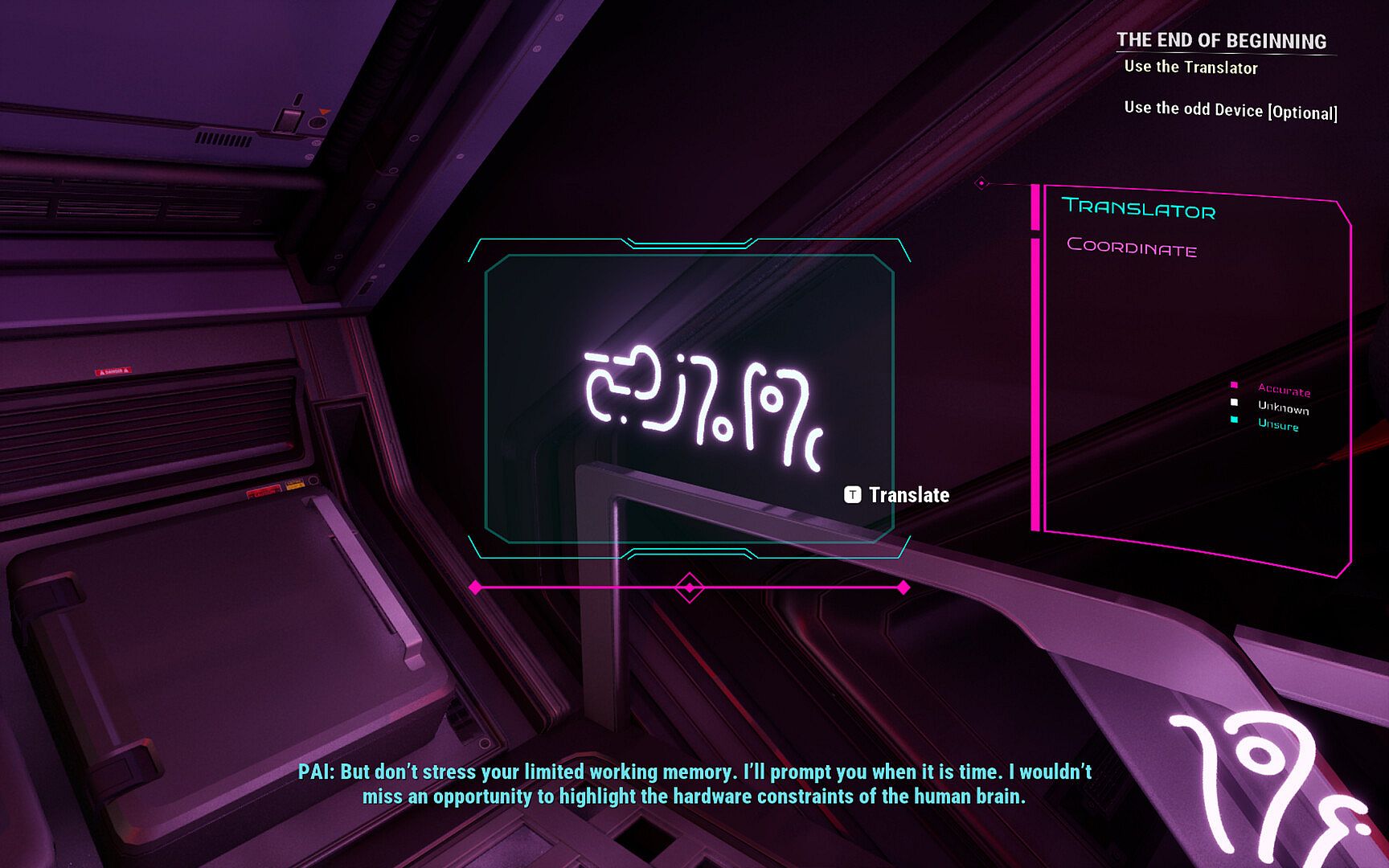 Alien symbols have meaning and can be translated. Your PAI has come up with a system capable of translating this language, but it is far from perfect without more data. You can rely on that system and gather data to improve translations, or make inferences and assumptions yourself to solve puzzles.