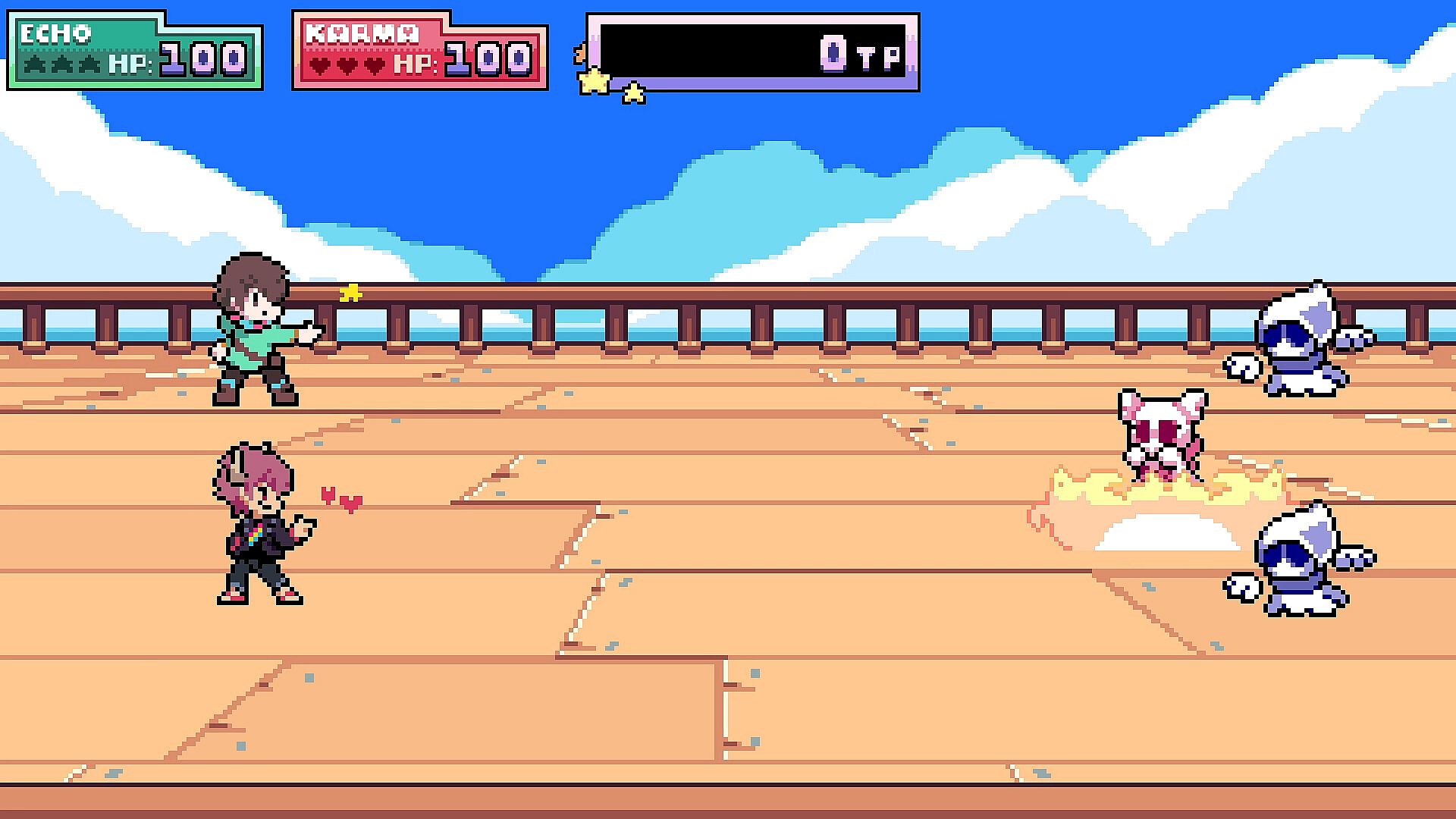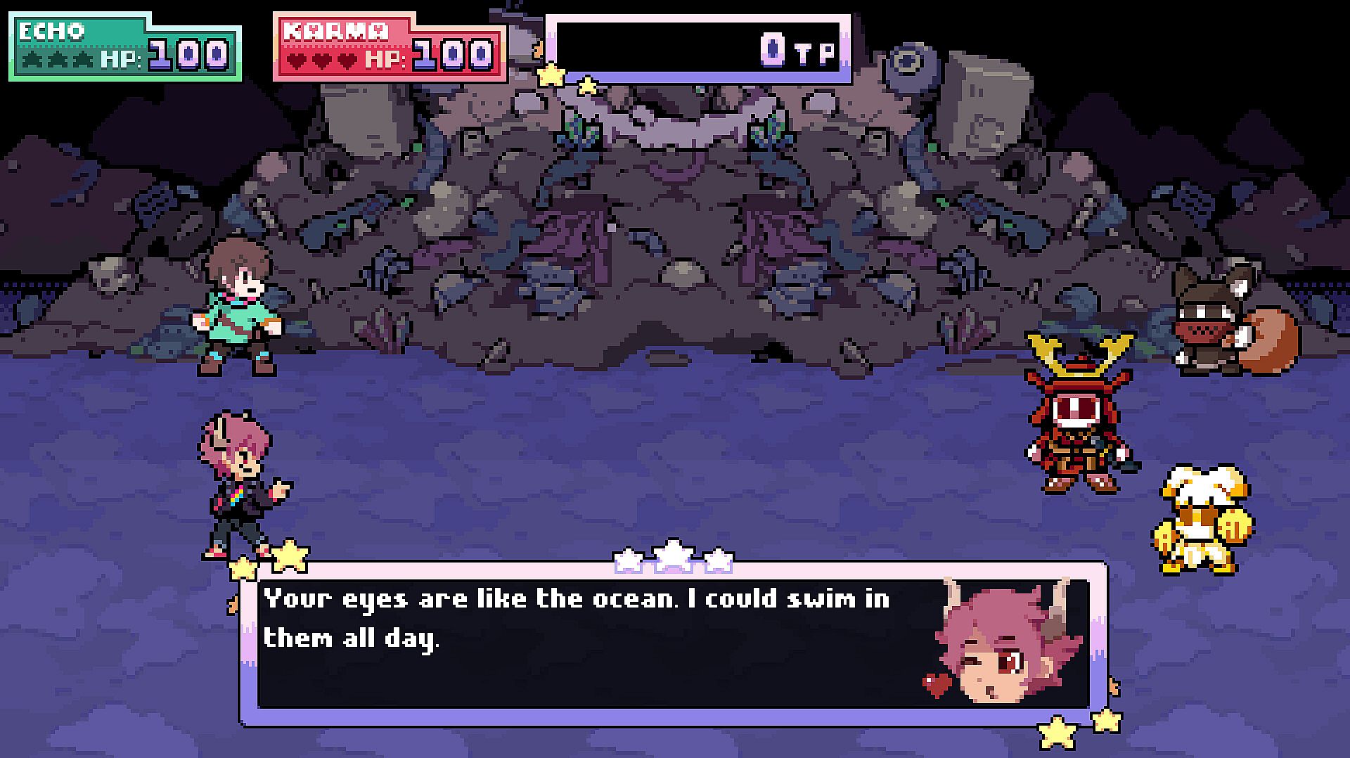 Echoes of Karma is a game about a flirty demon and gay magician who travel the multiverse. As they travel, they discover a threatening construct known as Glitches. The game is a turn based RPG, but with Blocking Mechanics during the enemy turn. Save TP by skipping your turn to use higher level abilities!