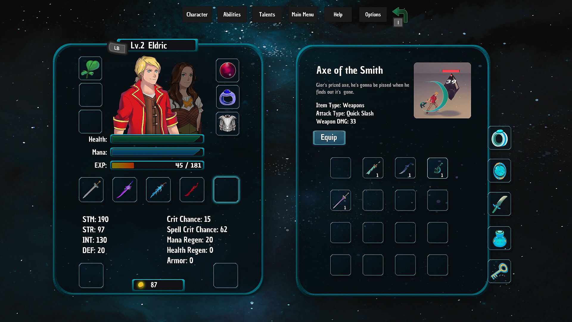 Follow Rin, a Princess devoted to her nation; and Eldric, a humble blacksmith's apprentice with a mysterious past as they embark on a journey that bridges time, space, and worlds unknown. Dive deep into the themes of the human condition and the perceived power of gods. Drawing heavily from fantasy and sci-fi elements while exploring a new take on the classic JRPG tropes typically found in the genre. Play the game as you see fit with a fully voiced cast or text only for that classic experience.