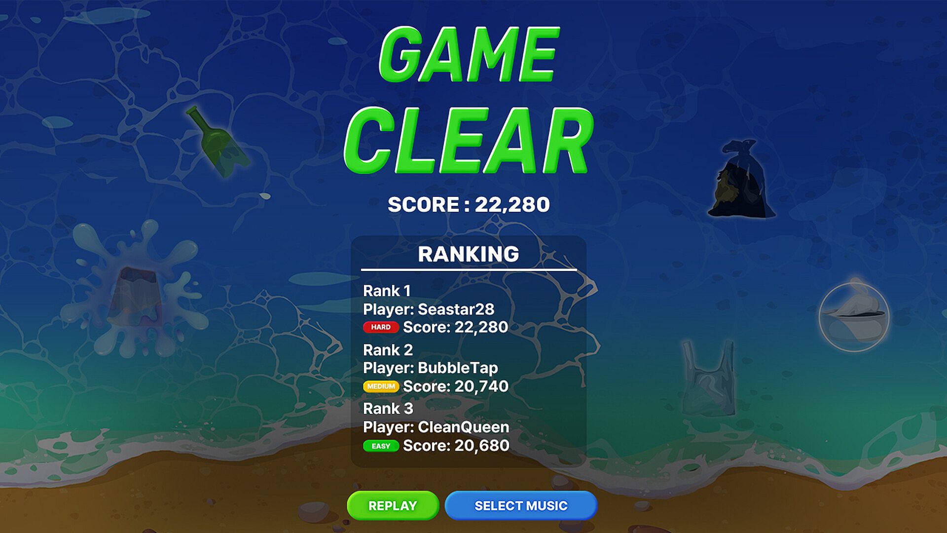 Inspired by OSU-style gameplay, players tap along to catchy beats as they collect trash swept along the tide. Time your taps perfectly to chain combos, earn points, and bring the ocean back to life.