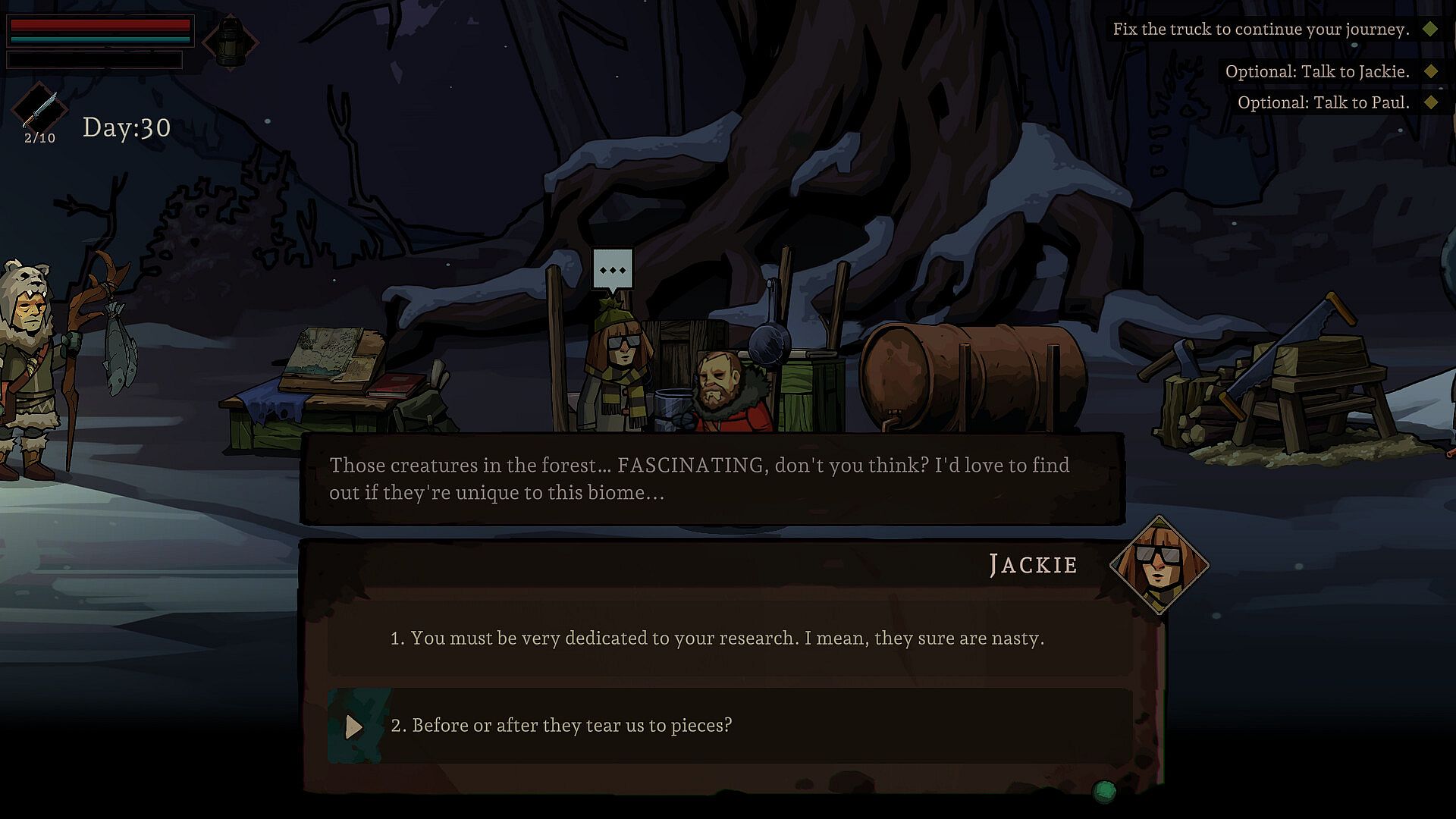 Each dramatic event during your traverse across Alaska leaves a permanent scar on your mind. Accumulating madness results in acquiring traumas, affecting your characters’ actions and sense of reality, opening new dialogue options, and enabling you to craft entirely new items.