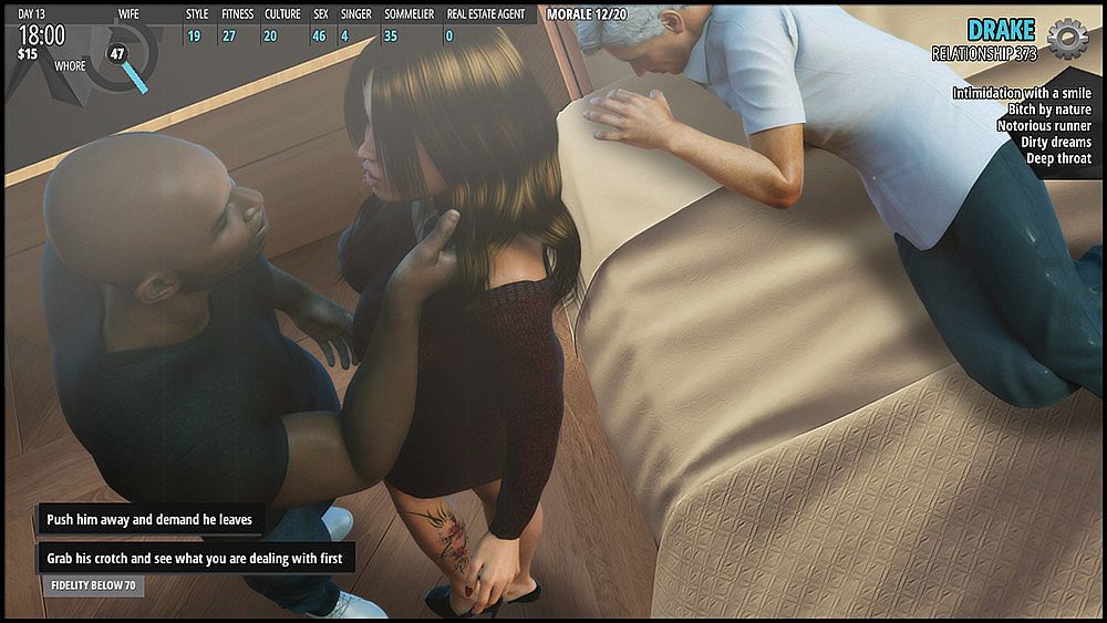 Eleanor 3 is a dating sim where you need to make various choices and perform actions based on a daily schedule in order to put her life on the right track. In this story, you'll meet characters from the previous parts as well as new ones. You're in command here, so, according to your actions, Eleanor will become their best friend or... take off her panties in front of them, exposing her wet cunt while awaiting their rough touch. But hey - she is married, so don't forget to balance life between her wifely duties and her more adventurous lifestyle. Though maybe balance is overrated?