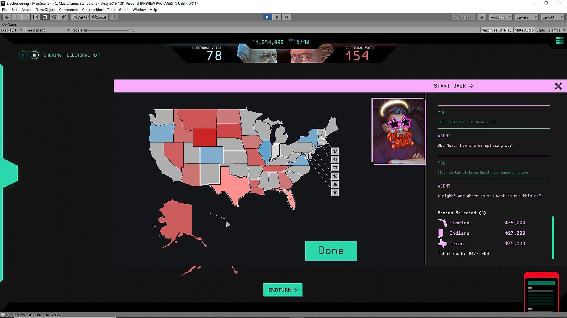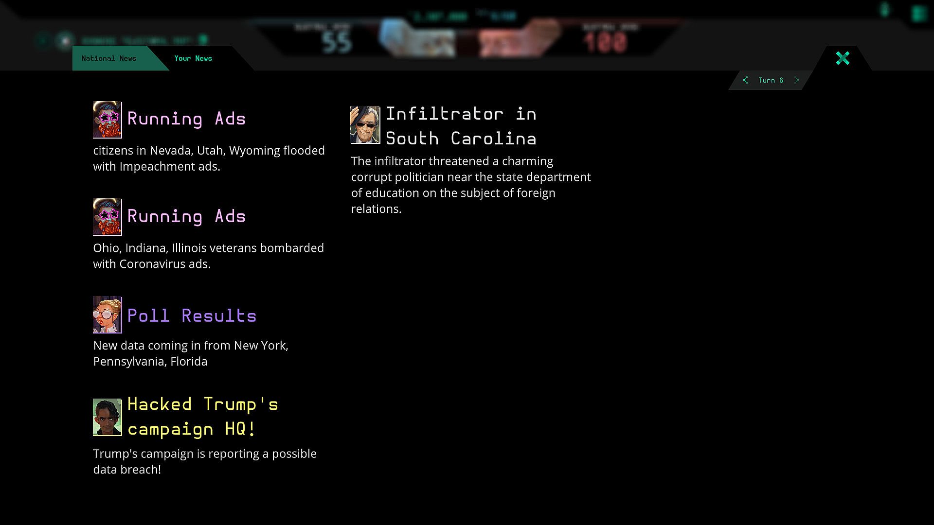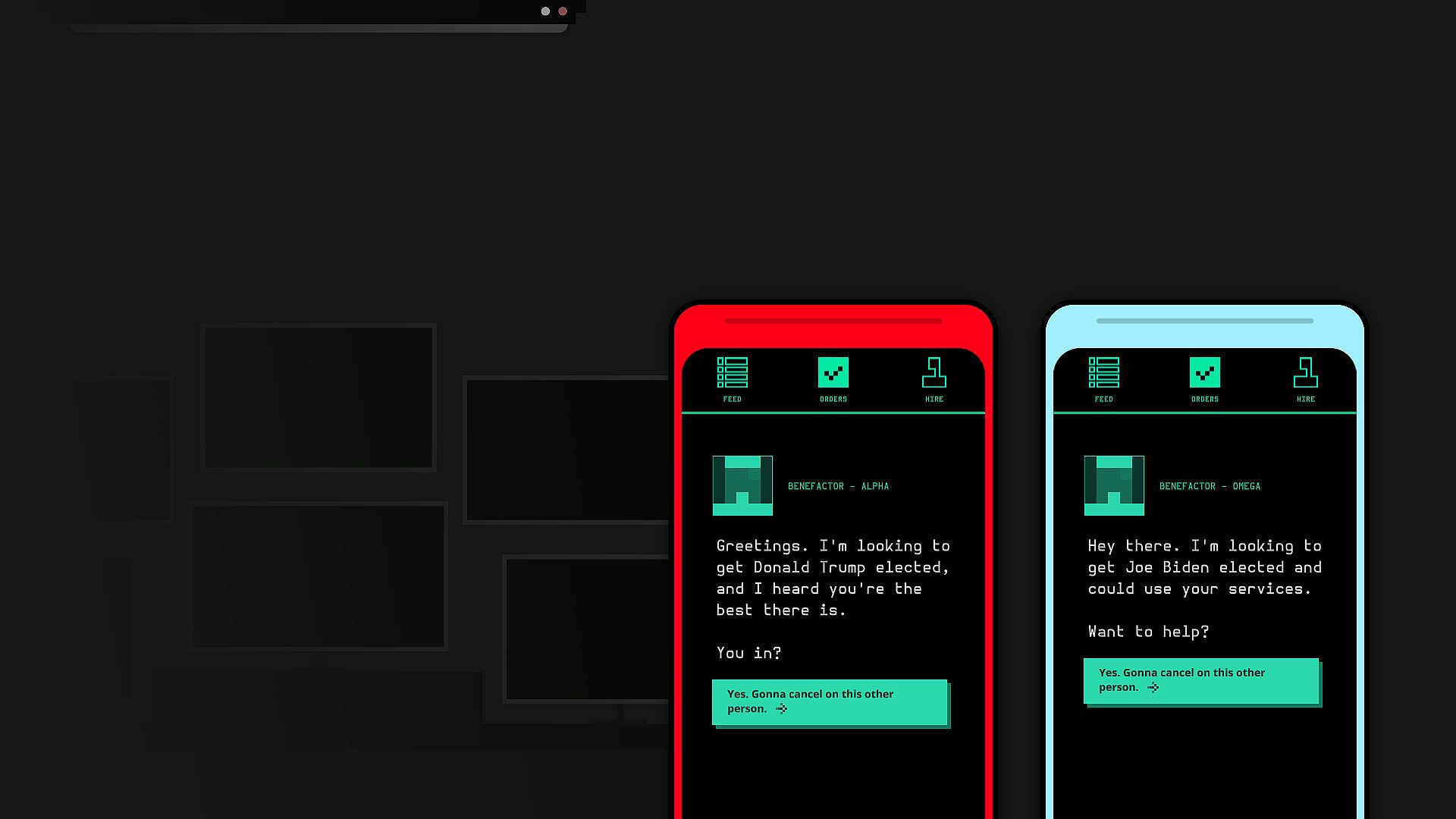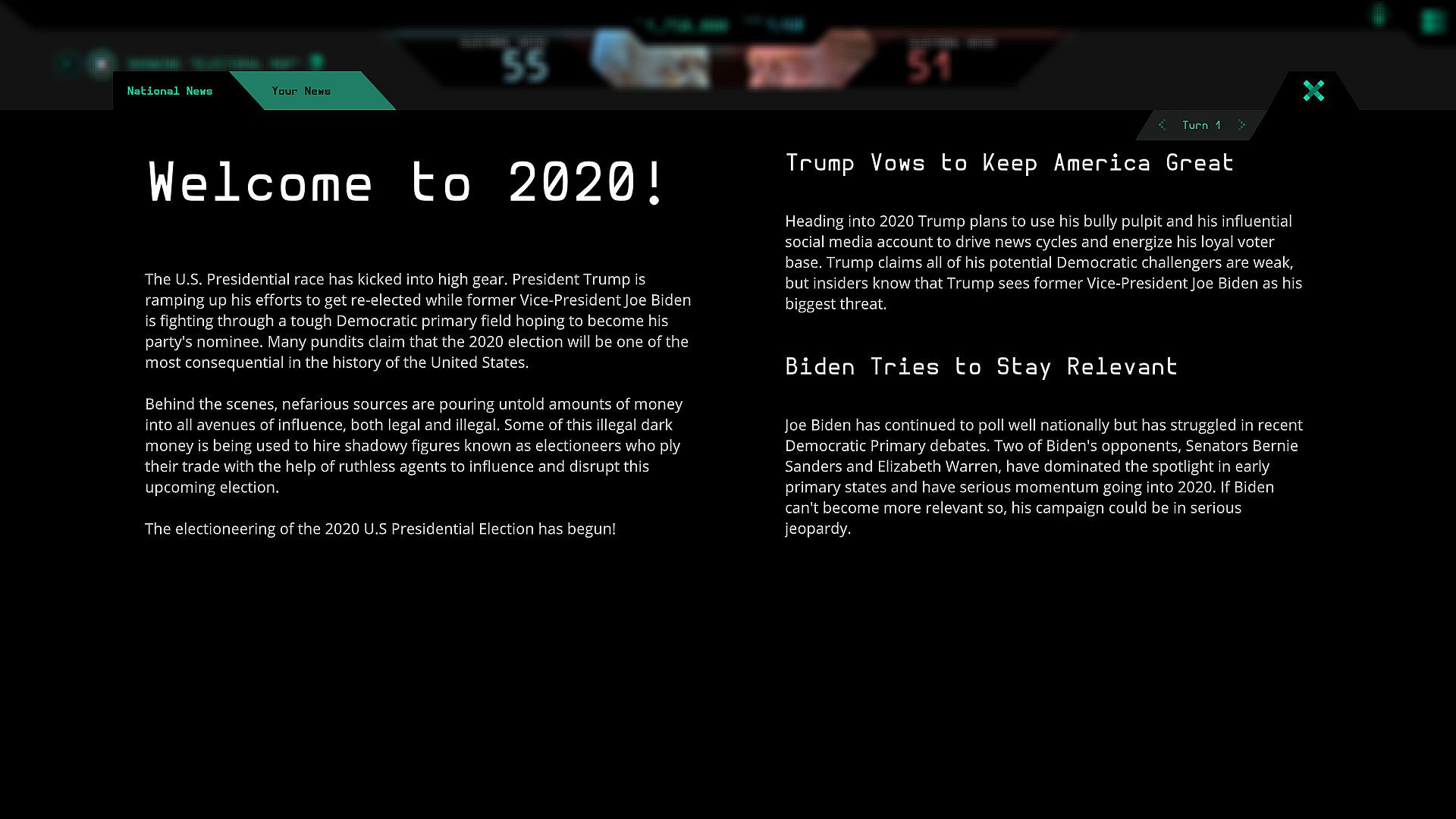It's been 4 years since you last got this phone call. It's time. America is choosing a new leader, and the world is watching. Some of us are doing more than watching; we're falsifying information, we're spreading lies. We're Electioneering. This time it's Trump and Biden; it's your job to use all the resources at your disposal to make sure that your candidate wins. Can you convince the voters to ignore what they see, ignore what they feel, and vote your way? Can you lie, cheat, and steal this election? We'll give you a weekly stipend and some contacts; the rest is up to you. If you get caught, we don't know you. If you lose, well. These aren't the kind of people you want to disappoint.
