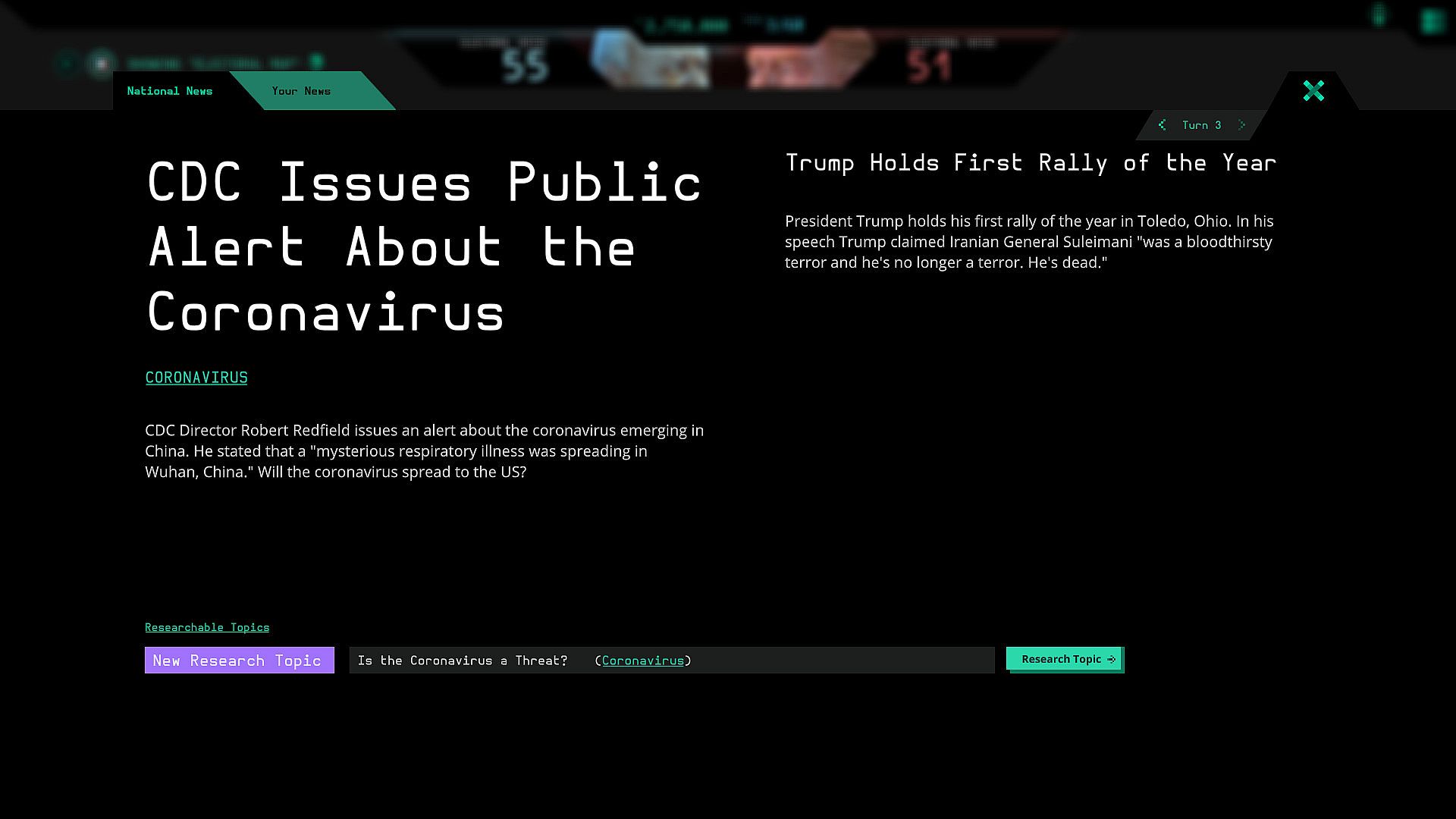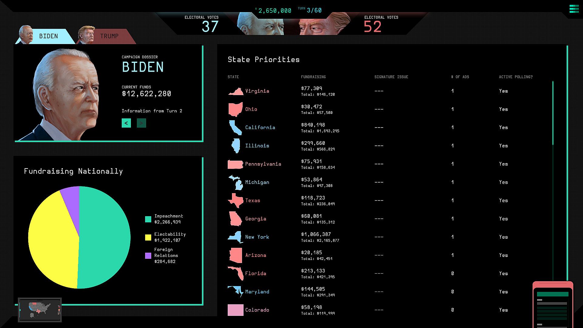 Pierce the Fog of War on a hidden electoral map and sway procedurally generated voters in this strategy simulation set during the 2020 election. Choose your candidate-Trump or Biden-and deploy tactics like polling, ad buys on researched topics, and agents such as the Hacker or Infiltrator to steal rival plans. Real-world events like COVID-19 and Trump's impeachment spawn issues with dozens of topics and arguments to spin, all while candidates clash unaware of your shadow role. Virtual voters, drawn from 15 base profiles up to 51,000 strong, drive outcomes based on shifting biases rather than fixed formulas. Electioneers adapt campaigns weekly with stipends and dark web contacts, lying through ads and social engineering to tip the scales. Strategy fans who relish voter-driven challenges and covert manipulation will master this indie Early Access title on PC.